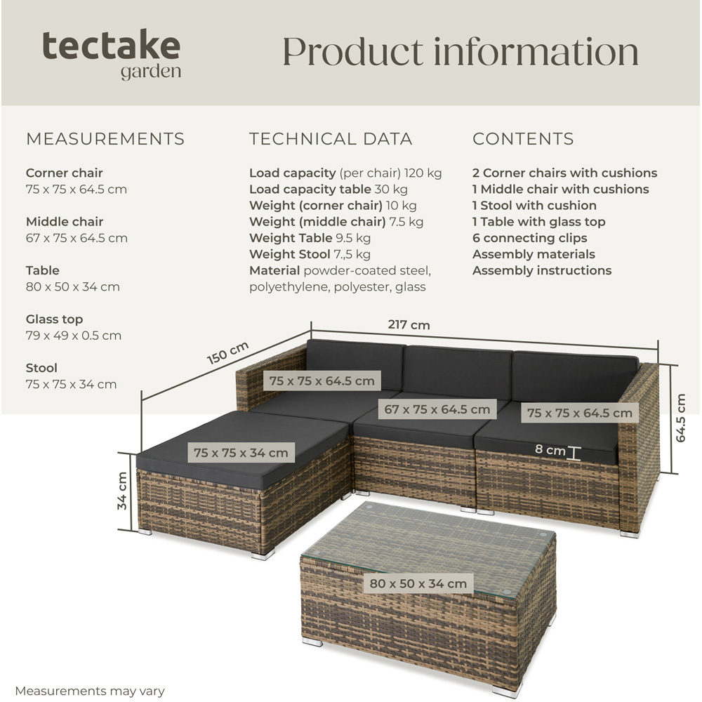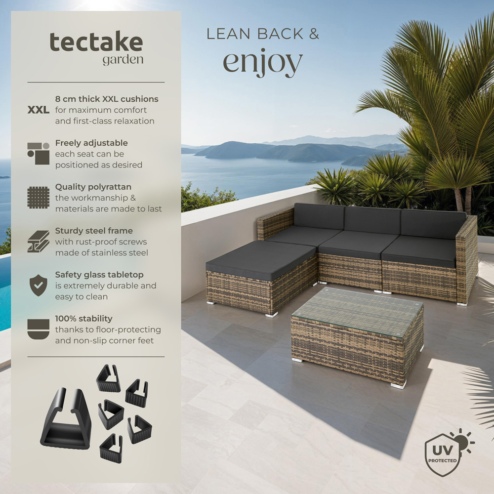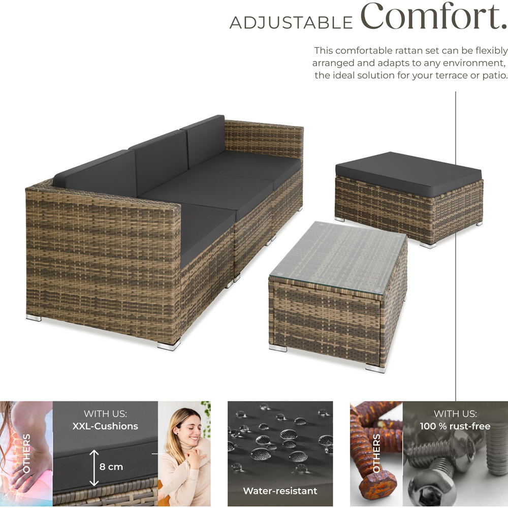 Create a place to chill with this beautiful rattan garden seating furniture set from tectake. The thick, soft cushions are perfect for outdoor relaxing with family. Along with cosiness and the right look, this easy-care set offers stability thanks to a robust steel frame. The individual elements of this functional set can be combined in multiple ways - for example into a lovely comfy sofa with coffee table.