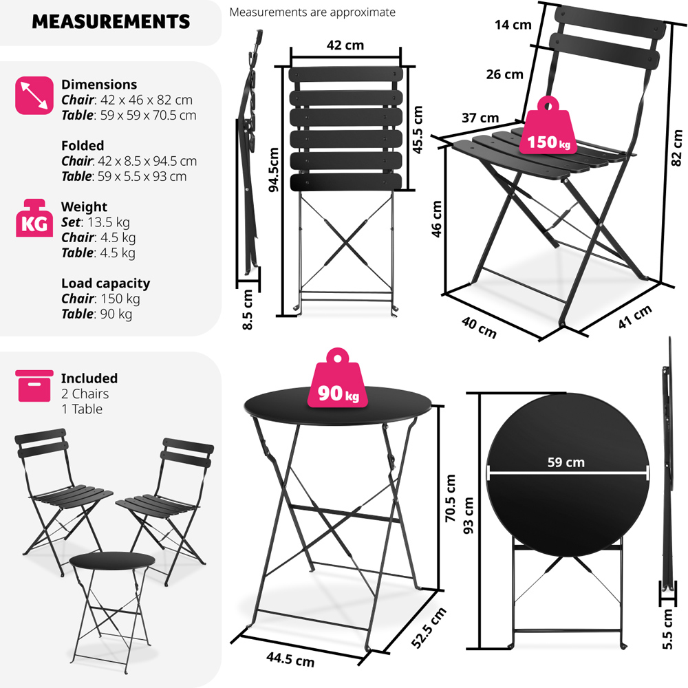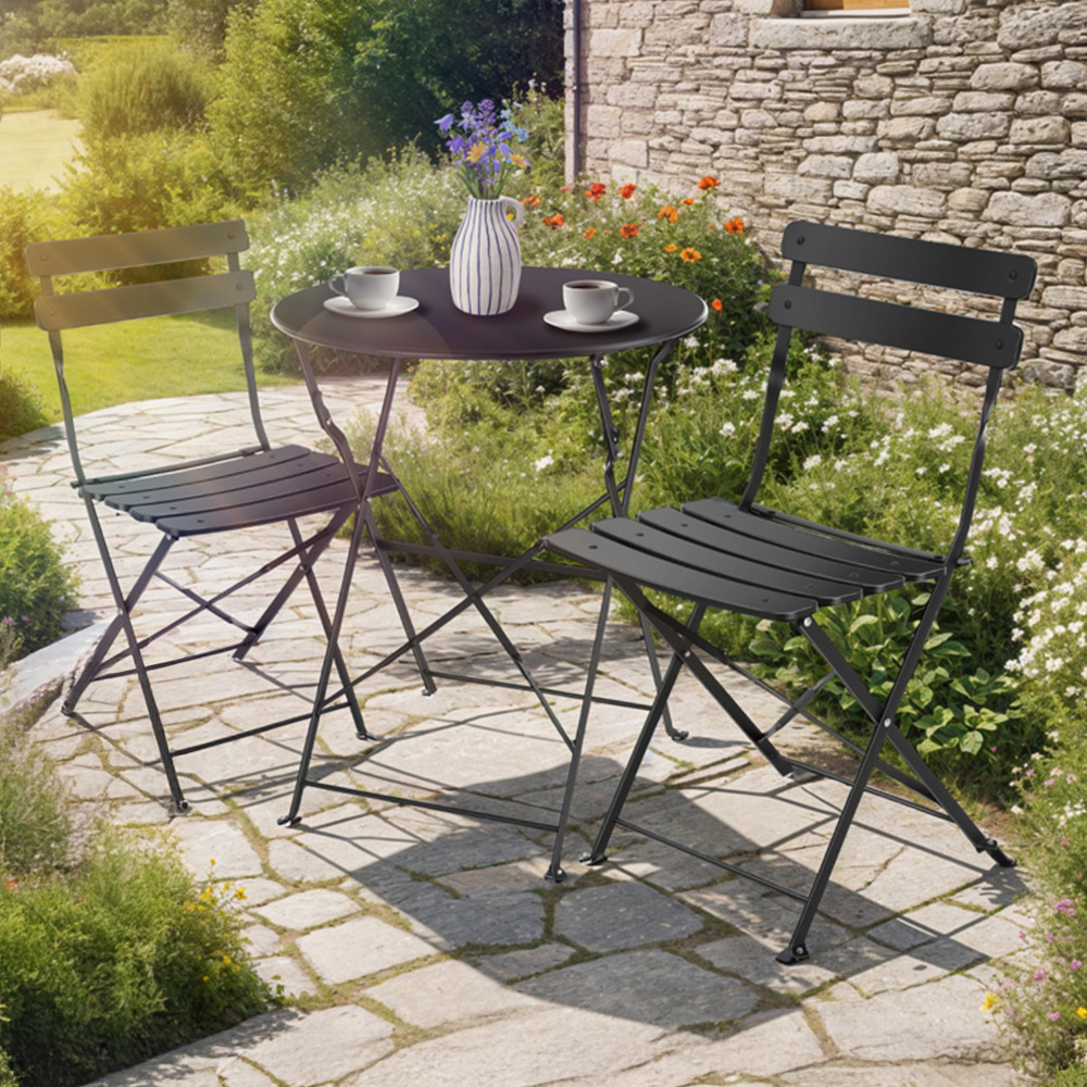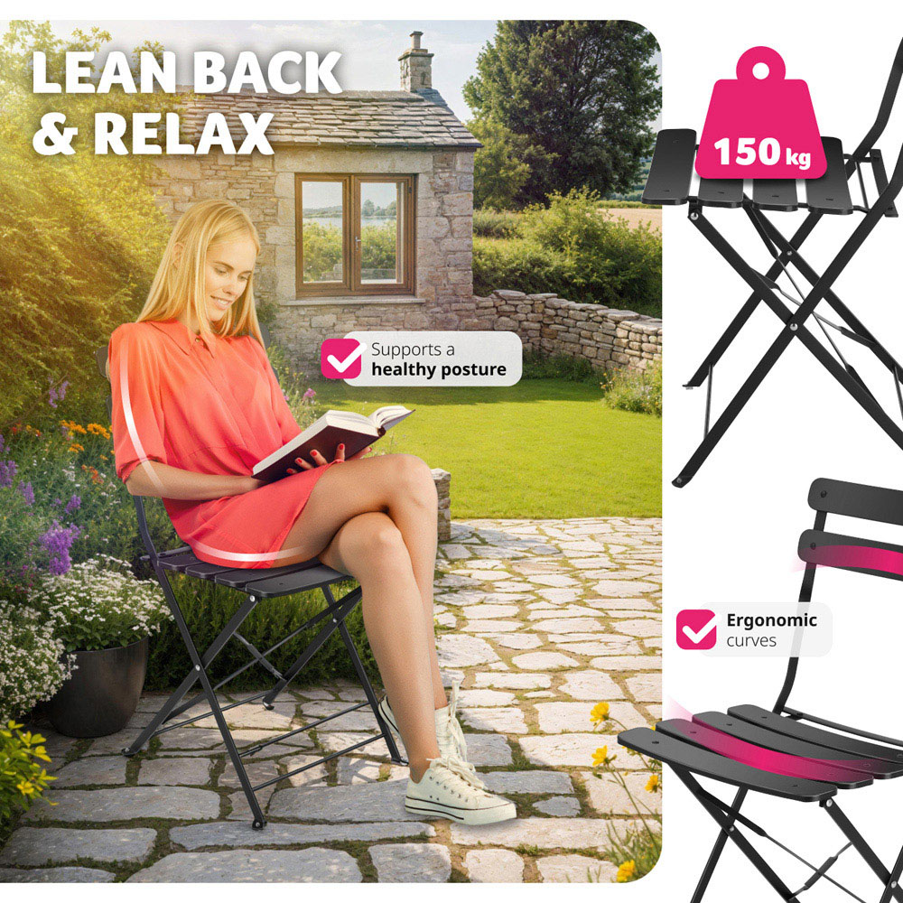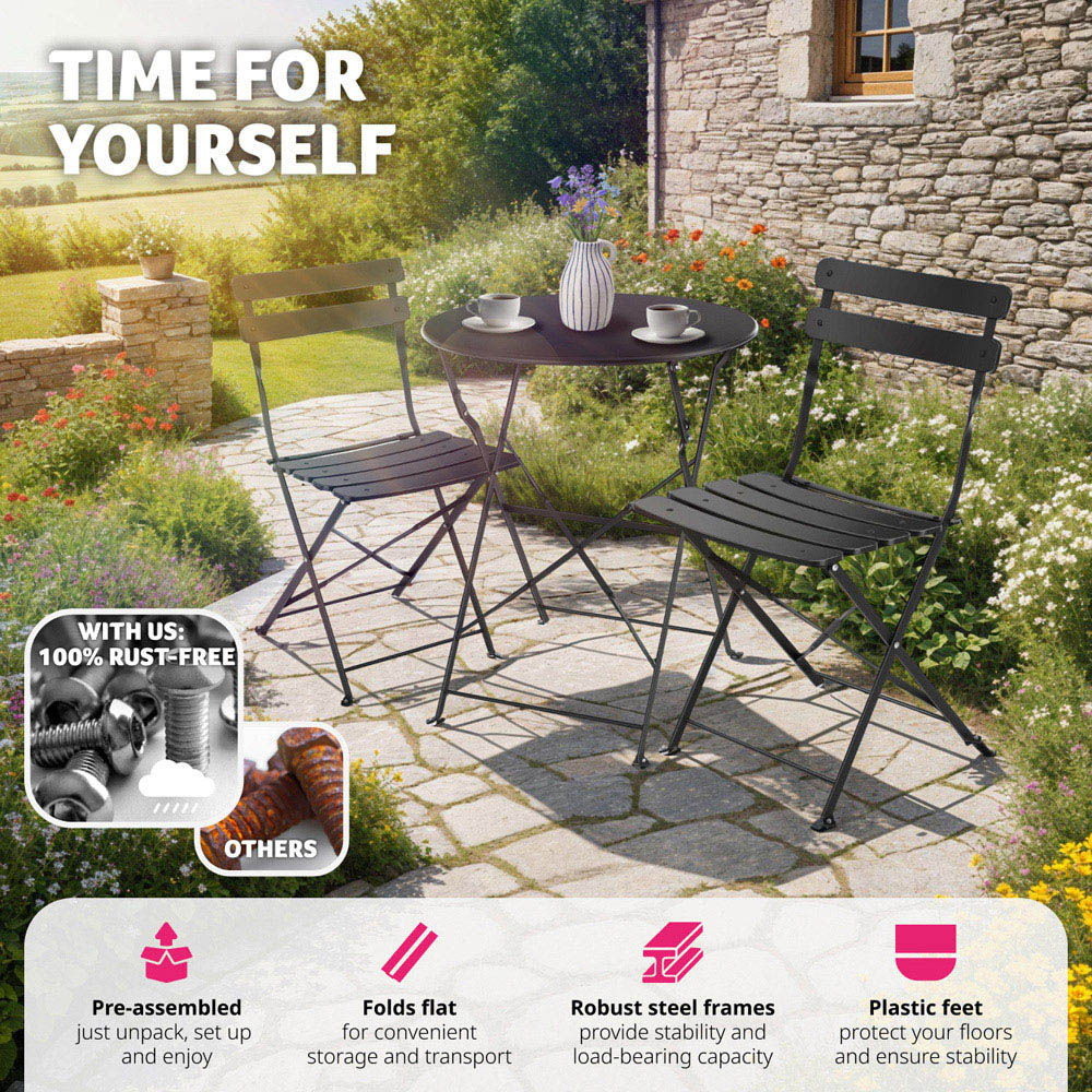 Discover the Frieda bistro set by tectake, the table and chairs for stylish, cosy and romantic outdoor moments. This high-quality set consists of a round bistro table and two matching dining chairs, ideal for small balconies and gardens. With the set's appealing slatted look, it seamlessly blends into any environment and adds a new level of elegance to your outdoor area. The garden furniture set impresses with its space-saving folding function, which allows you to easily store the table and chairs when not in use or to transport them effortlessly. No tedious assembly is necessary - the products are immediately ready for use and offer you maximum comfort. The solid frames made of powder-coated steel are extremely resilient and stable, thanks to floor-protecting and slip-resistant feet. The garden set is also extremely easy to care for and simple to clean. The high resilience and durability of the materials guarantee you years of enjoyment with your bistro table set. Whether you want to enjoy a cosy coffee in the morning or a relaxed dinner under the stars - the folding table and chairs offer your home the perfect combination of style and functionality. Enjoy the quality and comfort of the Frieda bistro set by tectake and transform your outdoor area into an inviting, exclusive dining space.