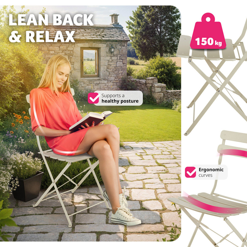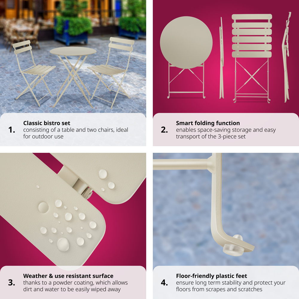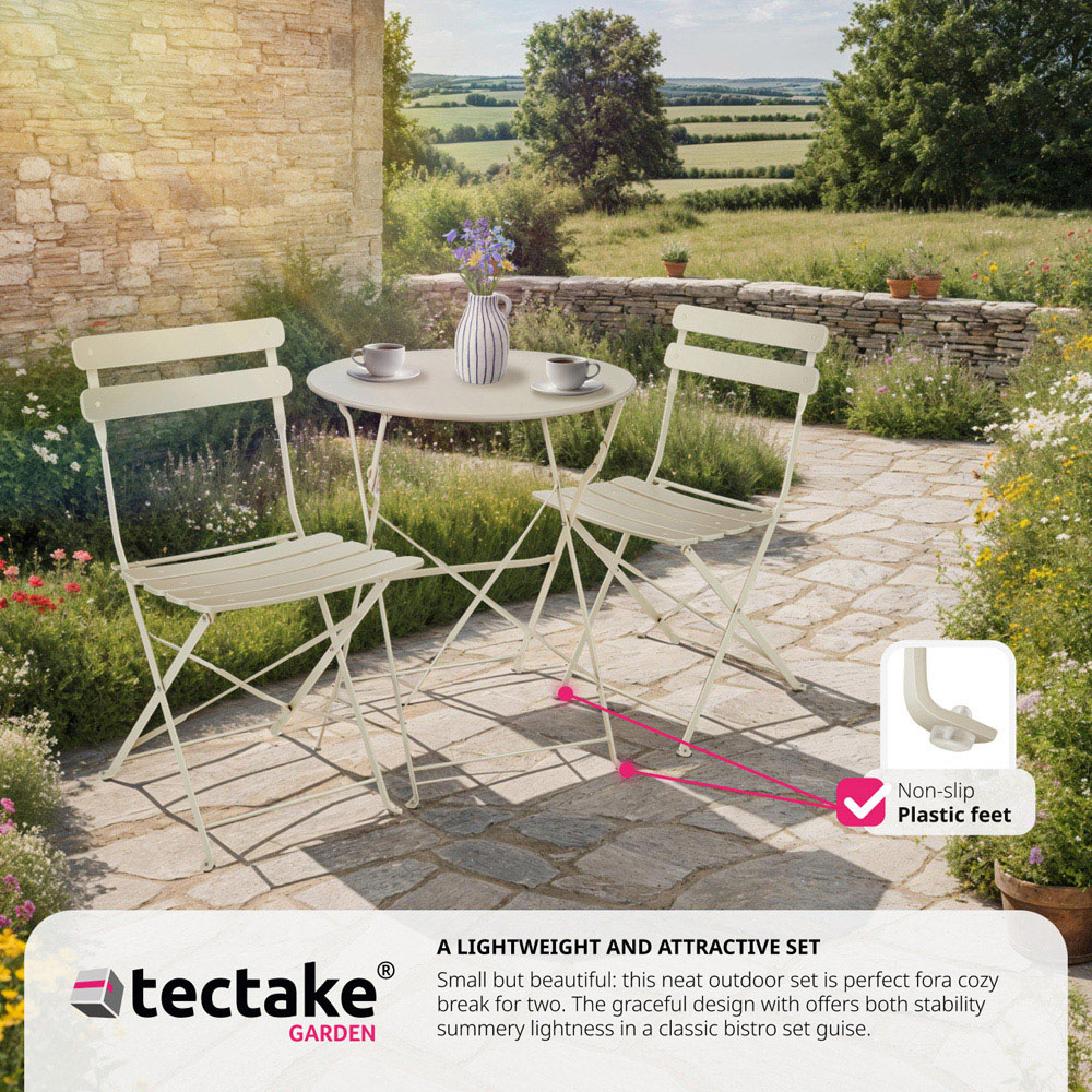 Discover the Frieda bistro set by tectake, the table and chairs for stylish, cosy and romantic outdoor moments. This high-quality set consists of a round bistro table and two matching dining chairs, ideal for small balconies and gardens. With the set's appealing slatted look, it seamlessly blends into any environment and adds a new level of elegance to your outdoor area. The garden furniture set impresses with its space-saving folding function, which allows you to easily store the table and chairs when not in use or to transport them effortlessly. No tedious assembly is necessary - the products are immediately ready for use and offer you maximum comfort. The solid frames made of powder-coated steel are extremely resilient and stable, thanks to floor-protecting and slip-resistant feet. The garden set is also extremely easy to care for and simple to clean. The high resilience and durability of the materials guarantee you years of enjoyment with your bistro table set. Whether you want to enjoy a cosy coffee in the morning or a relaxed dinner under the stars - the folding table and chairs offer your home the perfect combination of style and functionality. Enjoy the quality and comfort of the Frieda bistro set by tectake and transform your outdoor area into an inviting, exclusive dining space.