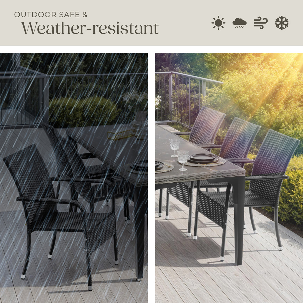 Elevate your outdoor dining experience with a stylish poly rattan garden chair in elegant grey, perfect for blending seamlessly with any home decor. This versatile piece of furniture combines comfort and durability, making it ideal for both relaxing in the sun and enjoying meals around a wooden table. The lightweight, stackable design and sun resistance of these garden chairs ensure hassle-free storage in a garden shed when not in use. Whether you're upgrading your patio or creating a cosy outdoor dining area, this garden chair is a must-have piece of furniture. The Rattan Chair Girona by tectake offers timeless design and high functionality in any home or garden. The simple appearance fits into any outdoor area and serves as an elegant addition to your garden or balcony. The high backrest invites you to lean back and relax, providing an excellent seating experience, especially when combined with the comfortable armrests. Whether for relaxing hours in the garden or dining on the wooden terrace, these chairs make every break even more enjoyable. Made from powder-coated steel and durable poly rattan, the balcony chairs are not only extremely weather-resistant but also highly durable and robust. Additionally, the non-slip foot caps ensure great stability on any surface. Thanks to the clever design, these chairs can be stacked, allowing you to store the set in a space-saving manner when not in use.