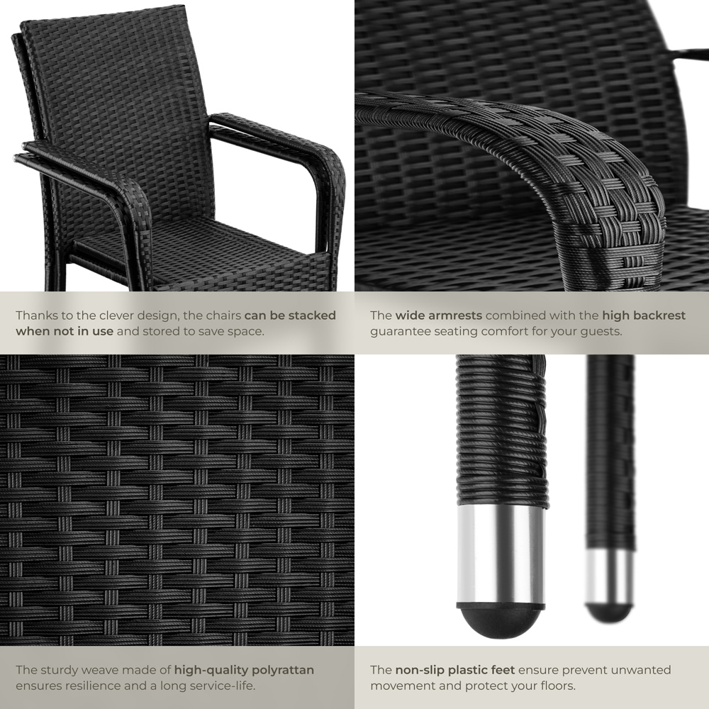 Elevate your outdoor dining experience with a stylish poly rattan garden chair in elegant grey, perfect for blending seamlessly with any home decor. This versatile piece of furniture combines comfort and durability, ideal for both relaxing in the sun and enjoying meals around a wooden table. The lightweight, stackable design and sun resistance of these garden chairs make storage at home easy, ensuring hassle-free storage in a garden shed when not in use. Whether you're upgrading your patio or creating a cosy outdoor dining area, this garden chair is a must-have piece of garden furniture. The Rattan Chair Girona by tectake offers timeless design and high functionality in any home or garden. The simple appearance fits into any outdoor area and is an elegant addition to your garden or balcony! The high backrest of the chairs invites you to lean back and relax, offering you an excellent seating experience in combination with the comfortable armrests. Whether for relaxing hours in the garden or dining on the wooden terrace, these chairs make every break even more enjoyable. Made from powder-coated steel and durable polyrattan, the balcony chairs are not only extremely weather-resistant but also highly durable and robust. In addition, the non-slip foot caps ensure enormous stability on any surface. Thanks to the clever design, these chairs can be stacked, allowing you to store the set in a space-saving manner when not in use.