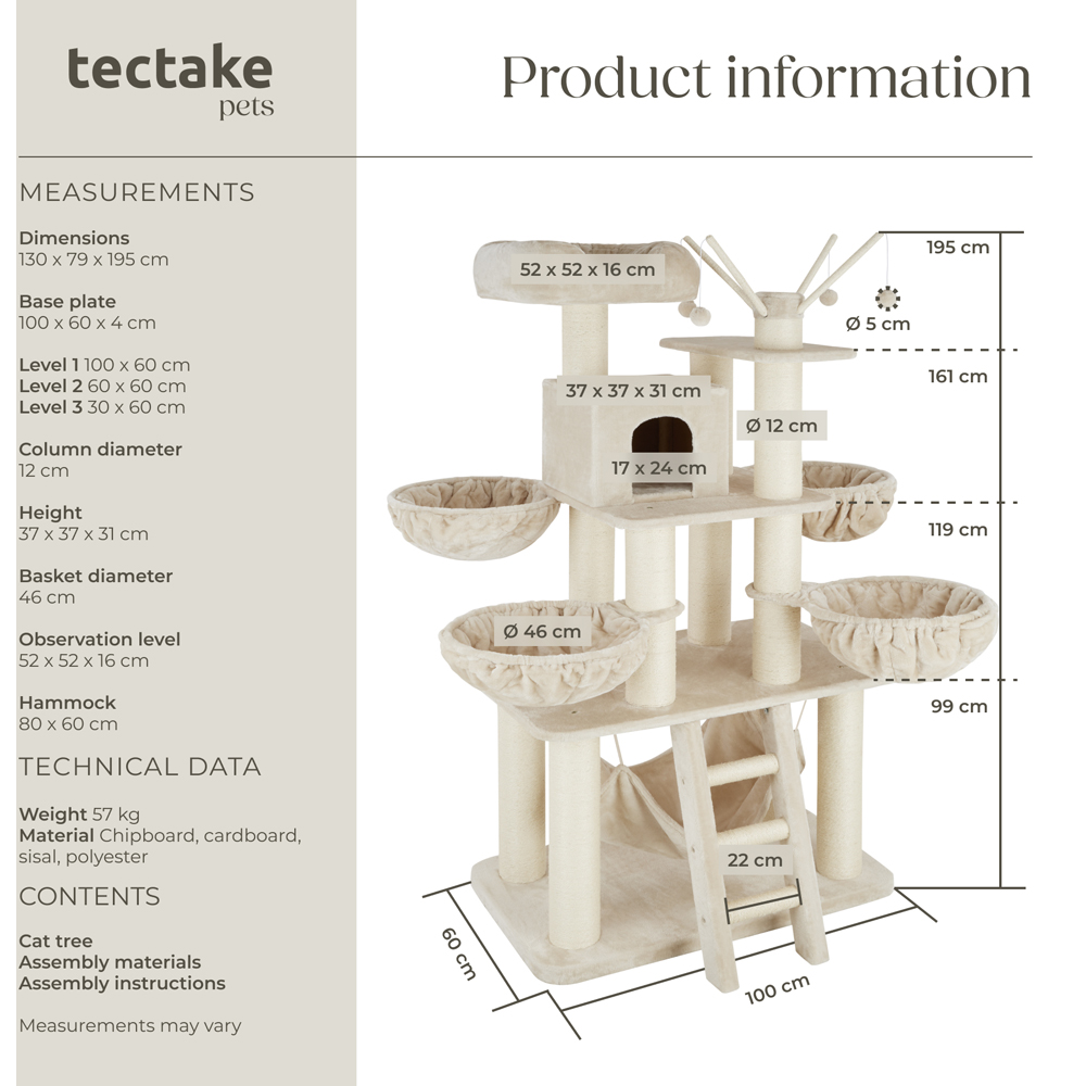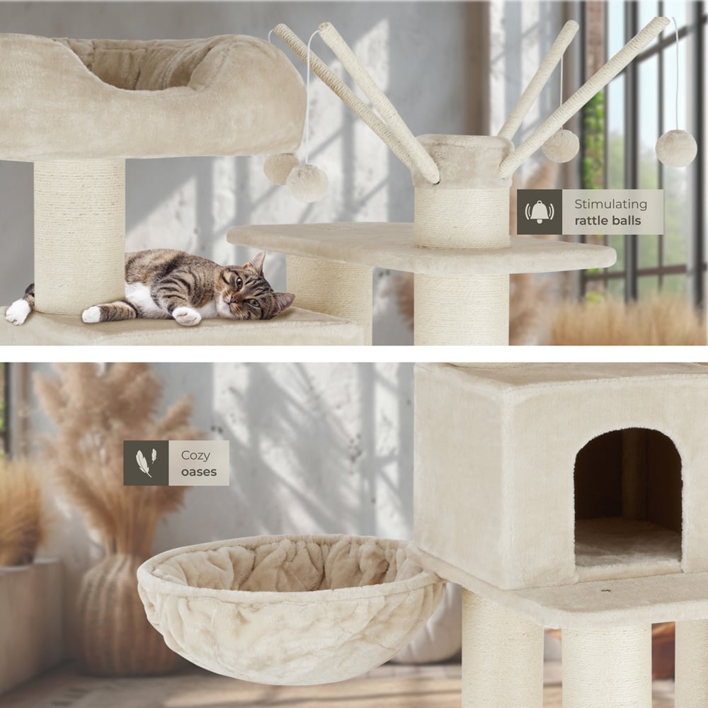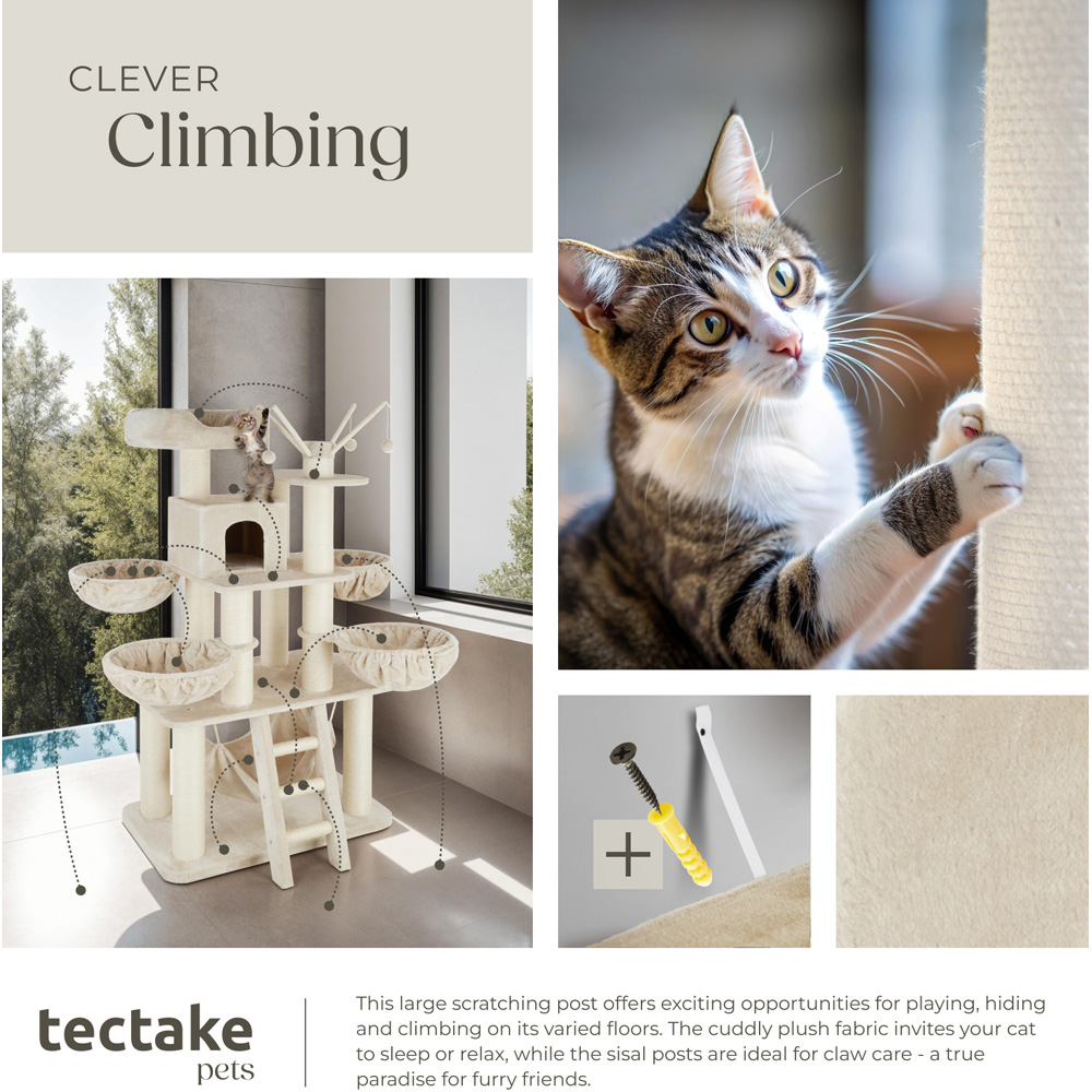 Solid cat tree from tectake is a plush climbing paradise that offers cats of all sizes three levels to explore and enjoy. The rattling ball toys promise fun and excitement, while the hanging beds and hammock are an ideal place for your pet to relax and hang out. Each individual thick post is covered in durable sisal, which is just perfect for sharpening claws, giving other items of furniture a much-needed break from the scratching! Your cat or kitten will love to explore the many levels and areas of this tower and find their favourite scratcher to get stuck into. This activity centre has thicker posts and larger beds than other cat trees, making it suitable for larger cats too. Exceptional durability and stability make this cat tree from tectake stand out - the perfect choice for adventurous house cats. Give your pet the ultimate playground with a large cat tree designed for endless fun and relaxation. Featuring multiple scratching posts, cosy beds, and engaging toys, this cat tree is perfect for keeping your cat active and entertained. With elevated platforms offering a perfect view, your furry friend will love their new favourite spot. Ideal for pets of all sizes, these trees provide the perfect combination of comfort and play.