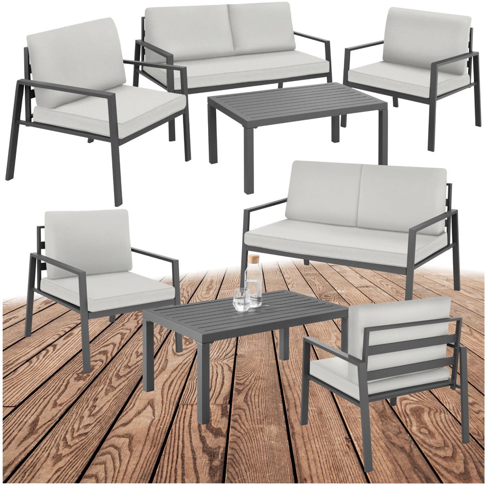 This inviting tectake Gothenburg 4 Seater Light Grey Dining Set in subtle shades of grey combines the lightness of summer with optimal comfort. The thick, spongy cushions are the highlight of this four-piece ensemble as they ensure the chairs provide a comfortable lounging position. The robust, rust-proof aluminium frame and the water-repellent accessories ensure these chairs are well-prepared for life as an outdoor furniture set. The tables simple yet elegant design help to complete the set and enable you to enjoy a relaxed outdoor dining experience. The product comes flat packed however assembly is quick and easy. In use, thanks to the practical cushions, this dirt-repellent set can simply be cleaned with a damp cloth. Furnish your outdoor area with this chic seating set from tectake.