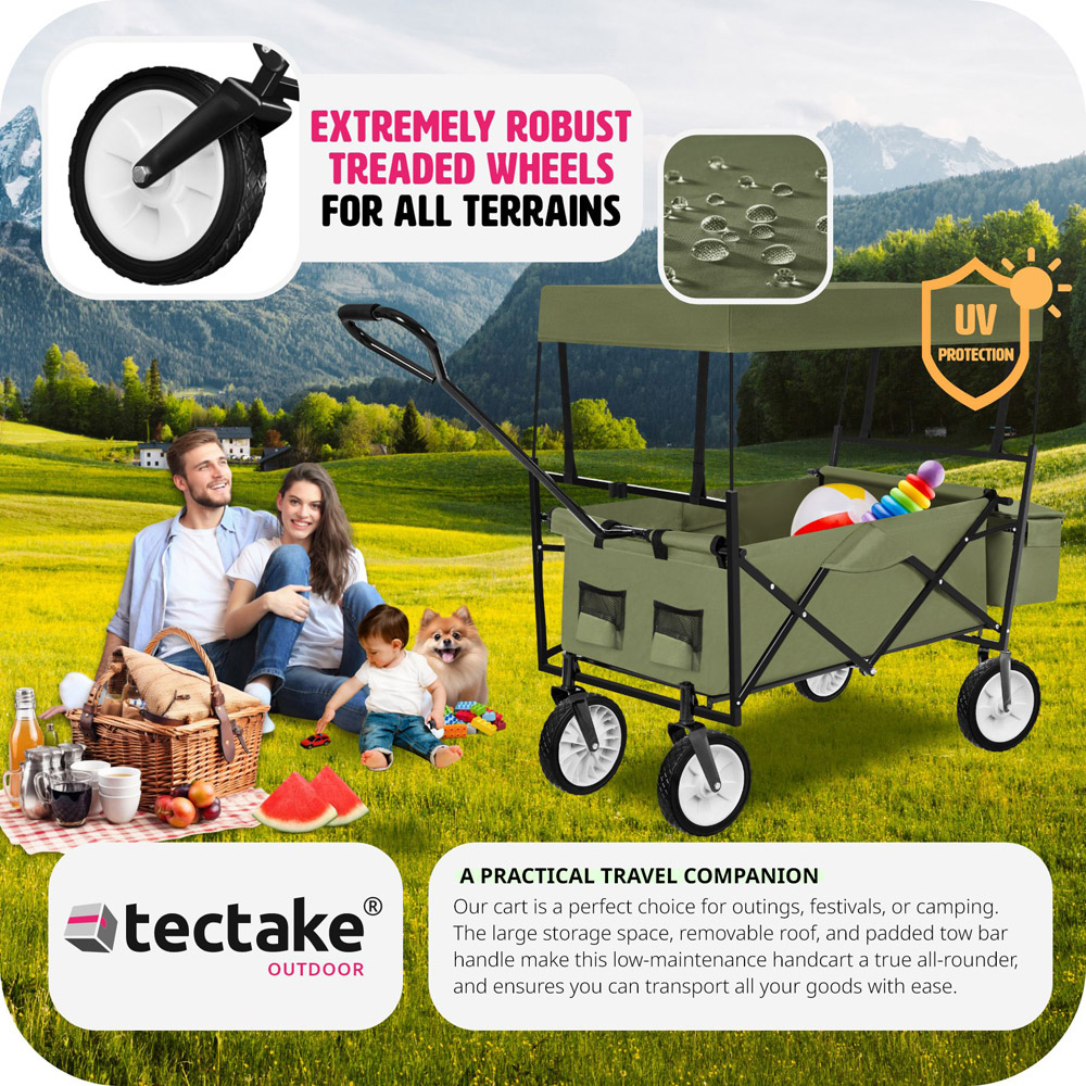 This tectake Green 3 Pocket Foldable Garden Trolley 80kg is the perfect companion for gardening, hobby and recreational activities. The hand cart can be collapsed in just a few steps and is ideal to transport in the included bag. The trolley is equipped with a rear bag, cup holder and a large loading area - so you can pack all sorts of things! The trolley comes with a roof to protect the transported items and gardening tools from the sun. Whether in the home garden, on a hiking trip or when camping, this folding pull along trolley is ideal for your outdoor activities.