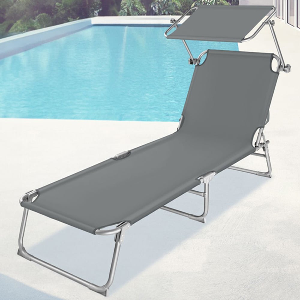 This high quality tectake Grey 4 Step Backrest Foldable Sun Lounger is the ideal leisure and holiday companion to relax and enjoy. The compact design of the folding sun lounger ensures space-saving transport and the sun lounger can easily be carried on the two integrated handles. The backrest of the sun lounger can be adjusted in four steps and the adjustable sun shade provides a sun-protected place for your head when needed. Relax in the home garden, on the beach or camping holiday with this folding sun lounger by tectake.