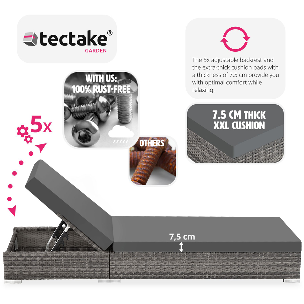 Sun Lounger Set - Ultimate Comfort with 5-Position Adjustable Backrests Transform your outdoor space into a luxurious retreat with the Sun Lounger Set - 2 Rattan Loungers, Side Table & Protective Cover. This premium set is designed to elevate your lounging experience, offering unparalleled comfort and style. Crafted with durable, weather-resistant materials, these reclining garden chairs are perfect for any patio, deck, or garden. Sun Lounger Set - Durable and Weather-Resistant Rattan Loungers Built with a sturdy aluminium frame, these sun loungers are designed to withstand the elements. The rattan construction is not only aesthetically pleasing but also UV-resistant and weatherproof, ensuring long-lasting durability. The aluminium frame further adds to the robustness, making these loungers a reliable choice for your outdoor relaxation needs. The set includes rust-free stainless steel screws, adding to its resilience and longevity. Sun Lounger Set - Adjustable Comfort with 5 Reclining Positions Each lounger in this set features a 5-position adjustable backrest, allowing you to find the perfect angle for sunbathing, reading, or napping. The backrests can be adjusted from flat to various elevated positions, ensuring maximum comfort for all your outdoor activities. The thick 7.5 cm cushions add an extra layer of comfort, making these garden recliner chairs perfect for extended lounging sessions. Sun Lounger Set - Convenient Side Table with Storage The included side table is not just a place to rest your drinks and snacks; it also features a handy storage compartment. The black-glass tabletop is both stylish and functional, providing a sleek surface for your essentials. The storage area beneath the table offers secure space for valuables, books, or other items, ensuring you have everything you need within arm's reach. Sun Lounger Set - Protective Covers for Easy Maintenance is a breeze with this sun lounger set. The included protective covers ensure that your loungers and table stay in pristine condition when not in use. The covers are easy to apply and remove, offering superior protection against dust, dirt, and weather elements. Additionally, the cushion covers are interchangeable between beige and grey, giving you the flexibility to match your outdoor decor. Sun Lounger Set - Thoughtful Design for a Complete Outdoor Experience This sun lounger set is more than just outdoor furniture; it's an invitation to unwind and relax. Its thoughtful design and premium materials make it a standout addition to any home. Whether you're looking to create a cozy corner for two on your terrace or enhance the appeal of your garden, this set is sure to impress. Indulge in the ultimate outdoor lounging experience with the Sun Lounger Set - 2 Rattan Loungers, Side Table & Protective Cover. Embrace comfort, convenience, and style with this all-in-one solution for your outdoor relaxation needs.