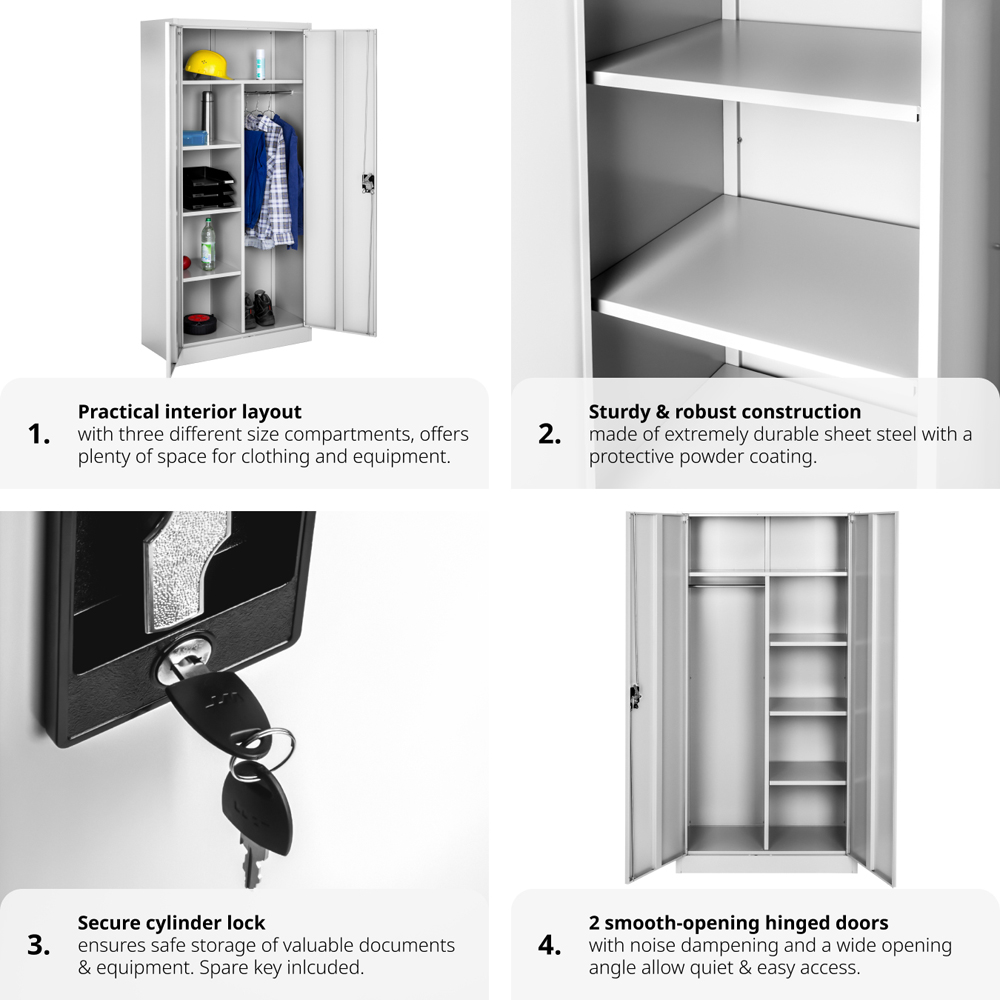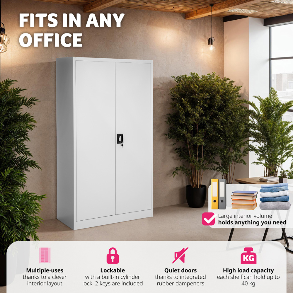 Experience superior organisation with the Tectake Grey Filing Cabinet with 6 Shelves and Rail, a quintessential addition to your home office storage solutions. Crafted from high-quality, powder-coated steel, this durable and elegant cabinet features reinforced swing doors that open up to 130 degrees with noise-dampening rubber buffers for quiet access. The lockable design, complete with a turning handle and a security cylinder lock with two keys, ensures your important documents remain protected. Easy to assemble, the cabinet measures 180 x 80 x 40cm, making it ideal for various spaces.