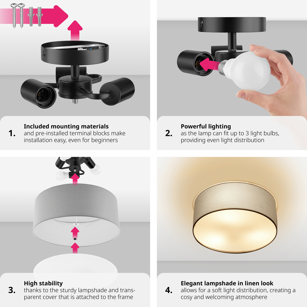 Experience the seamless blend of elegance and practicality with the Circum ceiling light, featuring a textile lampshade in a sophisticated linen look and a robust steel frame. This ceiling light not only enhances the aesthetic appeal of any space but also offers optimal functionality. Whether you're aiming to create a warm, inviting atmosphere in your living room or add a tasteful focal point in your hallway, this lamp's timeless design ensures it complements both modern and classic interiors. Its durable construction and the ability to house up to three bulbs allow for customisable brightness to suit your needs, making it a perfect choice for various settings.