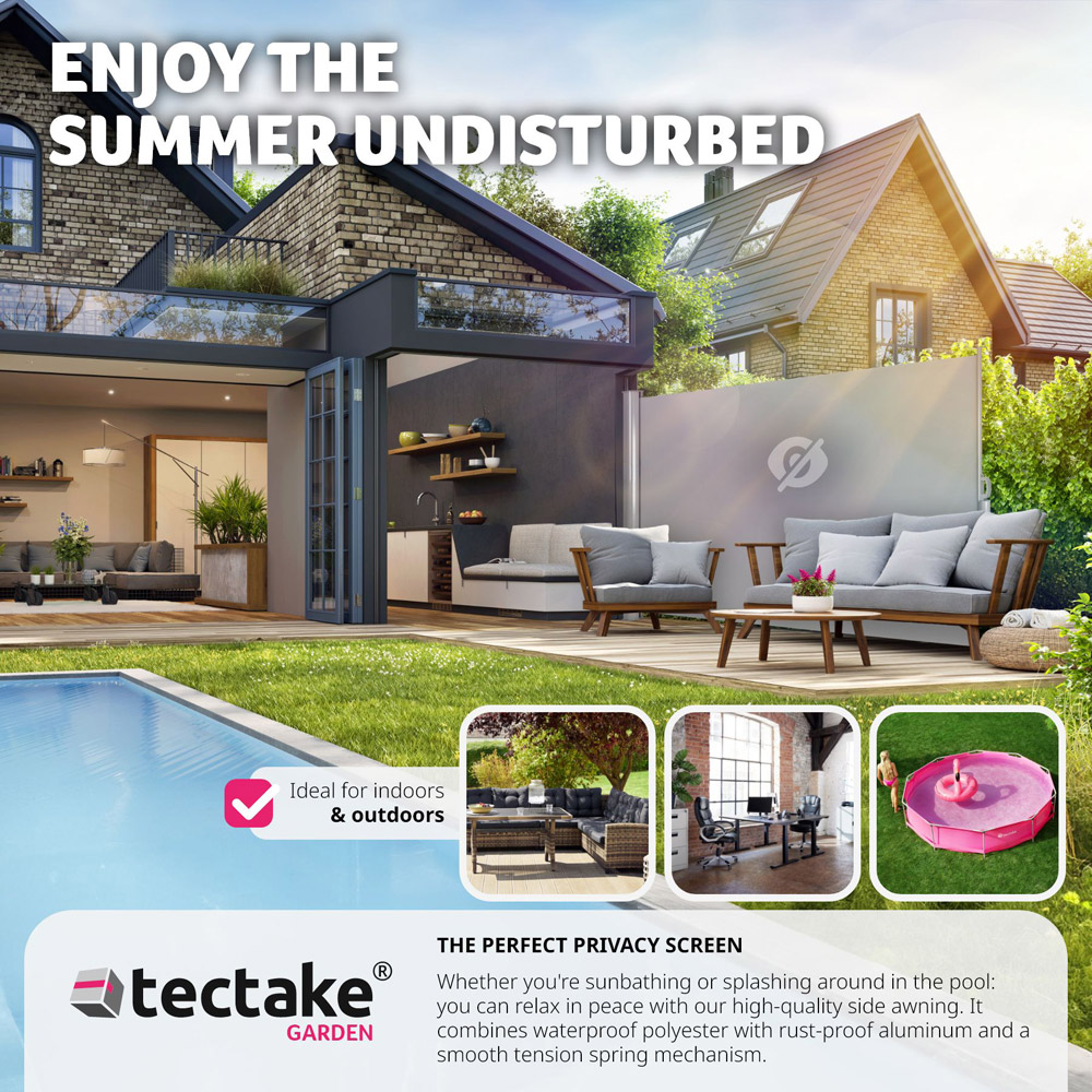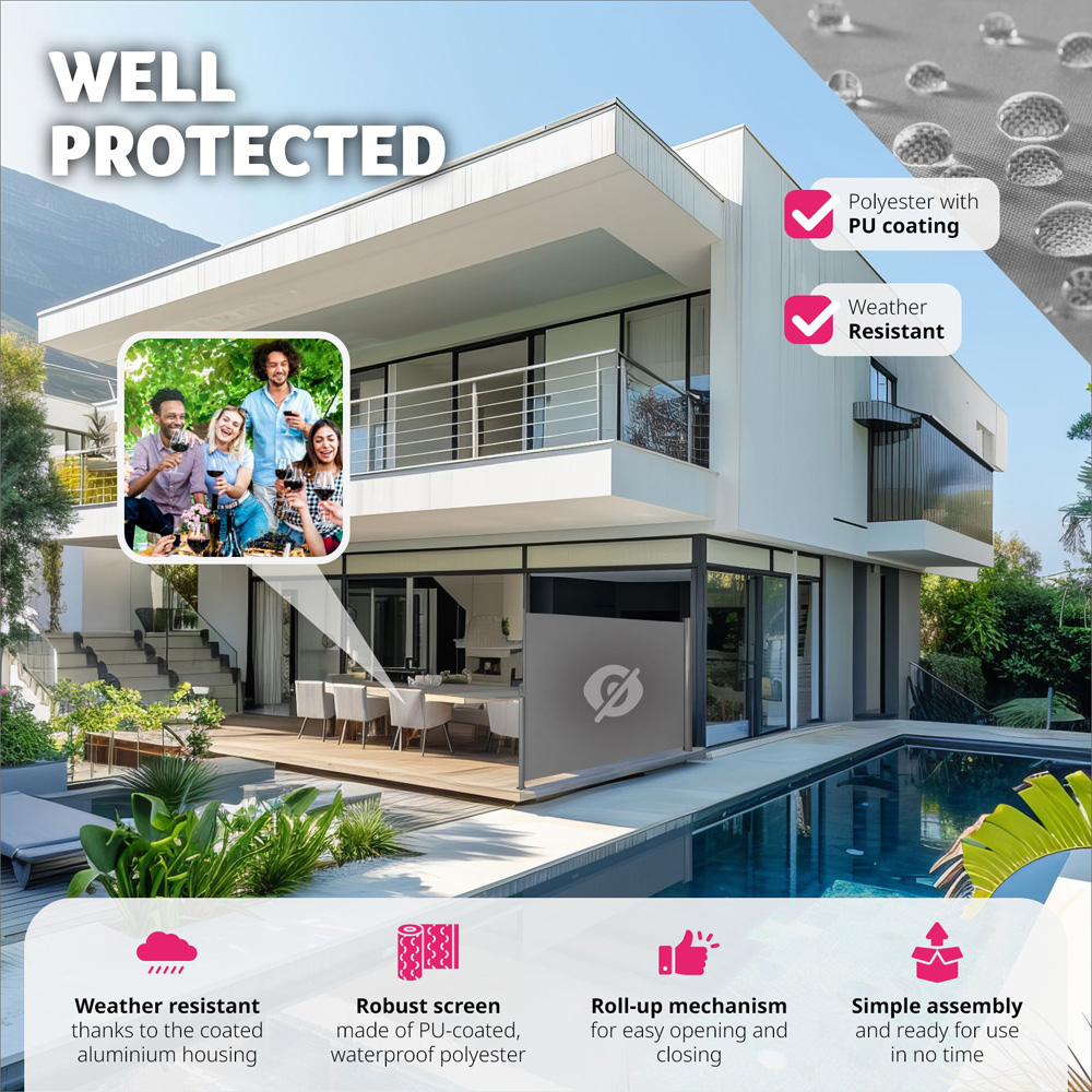 Transform your outdoor space into a sanctuary of privacy and tranquillity with the retractable side awning. This robust side awning is designed to shield you from prying eyes, low-lying sun, and gusty winds, making it a must-have accessory for any garden or patio setup. Crafted from high-quality, water-repellent polyester and a rust-proof aluminium frame, this side canopy is built to last, ensuring long-term durability and reliable performance. Ease of use is one of the standout features of the side awning. The automatic roll-up mechanism allows for effortless extension and retraction. Simply pull the screen out using the convenient handle and lock it into the supporting post. When done, the tension spring mechanism ensures a smooth and hassle-free retraction, allowing more time to relax and enjoy the outdoor space. Whether looking to create a shaded seating area or needing a wind barrier for the patio, this retractable side awning offers excellent protection against sun and wind, allowing enjoyment of the garden in peace. The aluminium casing protects the awning fabric from dust and dirt, further extending its lifespan. For a stress-free setup, the garden privacy screen comes with all necessary assembly materials, including screws, wall plugs, and washers for both the housing and the post. With the help of a power drill or a wrench, the installation process is quick and straightforward, ensuring that the side awning remains stable and secure, capable of withstanding various outdoor elements. Its sleek and modern design blends seamlessly with any garden decor, offering both practicality and style. This versatile product is the perfect solution for those looking to enhance their outdoor living experience, providing shade, privacy, and protection in one comprehensive package. Take the first step toward a more comfortable and private outdoor living space.