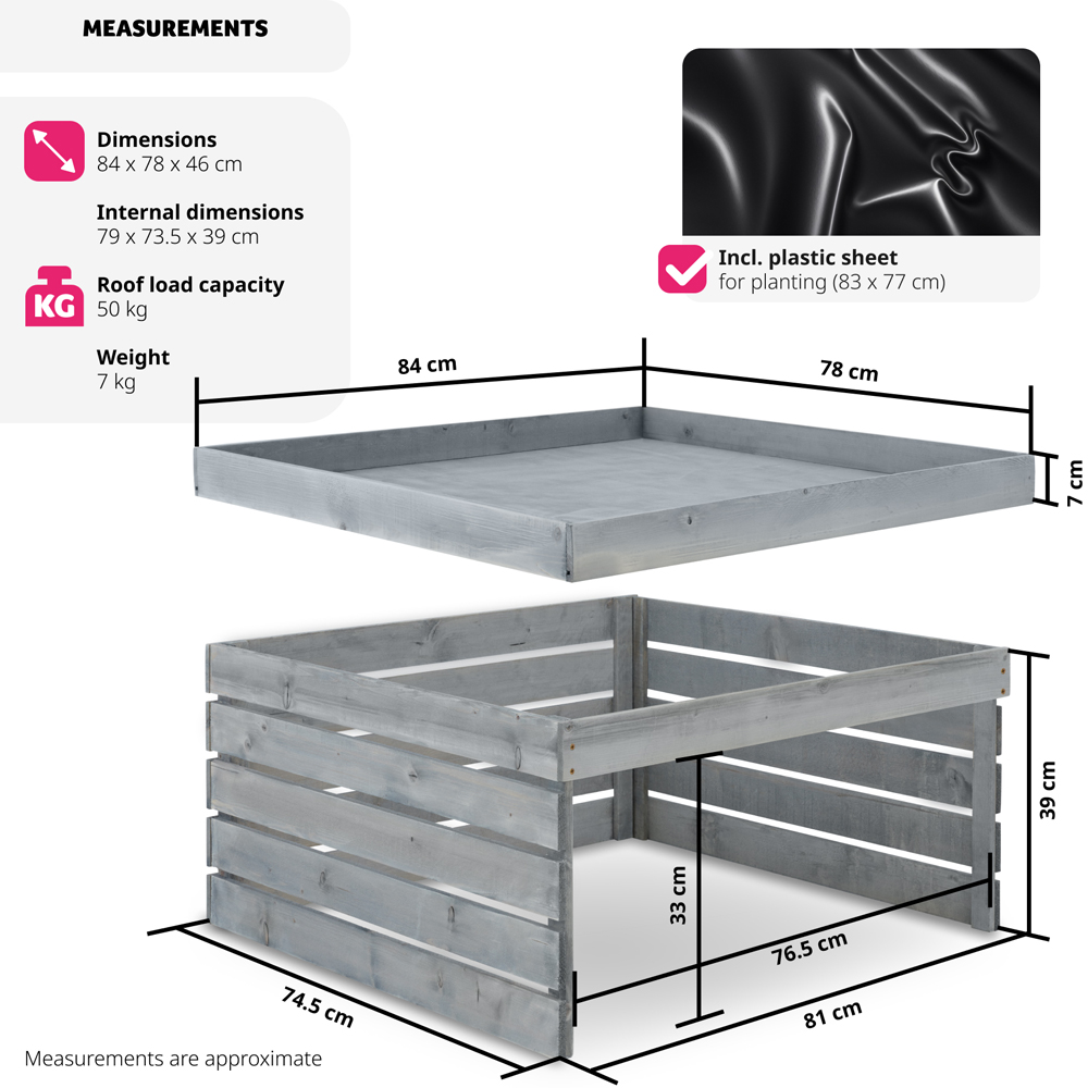 Discover the robot lawn mower garage Hortus by tectake, a charming and practical solution for your garden. The garage's weatherproof frame is made from durable and stained pine wood slats and can be universally used for numerous models of robotic mowers and accessories. It thus provides your autonomous lawnmower with a secure, easy-to-use home shelter which reliably protects against rain, hail and sunlight. A special highlight of the auto mower garage is the large roof, which can be filled with stones or planted with grass, decorative flowers and similar according to taste. This allows it to blend harmoniously into any outdoor area and ensures a natural look. Thanks to the protective cover, the interior of the Hortus robot lawn mower garage by tectake remains dry, and the wood is protected from weathering. Size: 46 x 84 x 78cm.