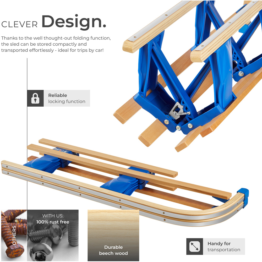 The wooden sledge Jeffrey from tectake offers optimal comfort with its generous seating area and is perfect for enjoying the snow! The combination of durable beech wood and stable steel runners makes the wooden sledge extremely resilient and long-lasting for a safe ride on any slope. The solid workmanship ensures high stability and safety, perfect for children who want to enjoy winter fun on their sledges. Thanks to the clever folding function, the wooden sledge can be transported effortlessly and stored in a space-saving manner. Whether in the boot or at home in the cupboard, this sledge adapts to your everyday life and is ready for use at any time. With the supplied pull rope, the sledge becomes a versatile companion for children. Whether as an aid when pulling or as a holding option during the ride, the pull rope provides additional comfort and makes transport through snowy landscapes easier. A special highlight of these children's sledges is the supplied snowball tongs, which guarantee the formation of perfect balls ideal for fun snowball fights in between. The wooden sledge is the perfect companion for unforgettable winter days on the snow and ice with your children!