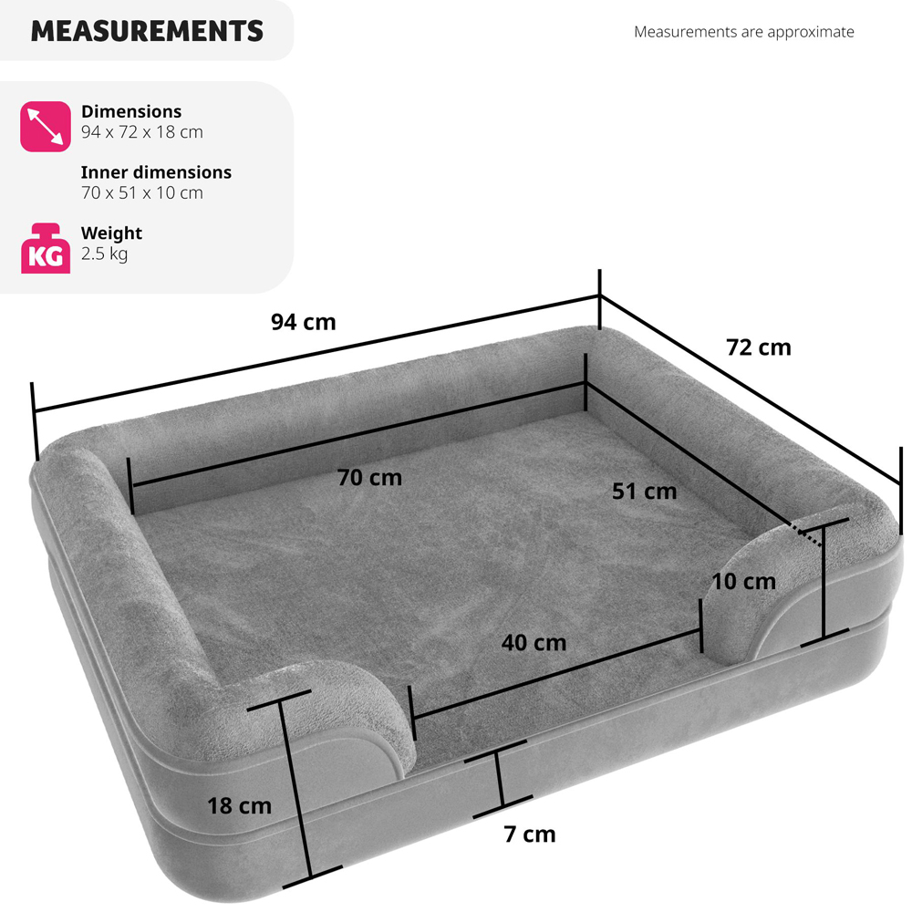 Give your furry friend the ultimate comfort with the Orthopaedic Dog Bed Kimba, designed for dogs of all sizes. This luxury bed features thick padding and a supportive foam mattress to relieve pressure on joints, making it perfect for senior dogs or those needing extra care. The raised edge doubles as a pillow, offering your pet a cosy spot to rest. Whether for a puppy, a large dog, or even a cat, this versatile bed suits every need. Available in an elegant grey, it is a stylish addition to any home. Easy to clean with a washable cover, this new orthopaedic dog bed ensures comfort and durability for your beloved pets. Perfect for small to large companions. Experience your pet more relaxed than ever in your home on this orthopaedic dog bed. The pet bed's thick cushion combination of ergonomic dimpled foam and soft memory foam mattress protects the joints and adapts individually to the body dog's shape. A strong sense of security is provided by the raised, large wide edge of the sofa bed, which also serves as a cosy headrest. The soft, waterproof plush cover is easily removable and washable thanks to the zipper, ensuring your dog's basket remains fresh and clean. A luxurious and non-slip resting area for all pets: the high-quality dog bed Kimba by tectake.