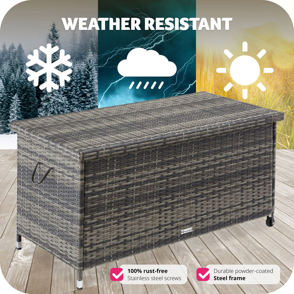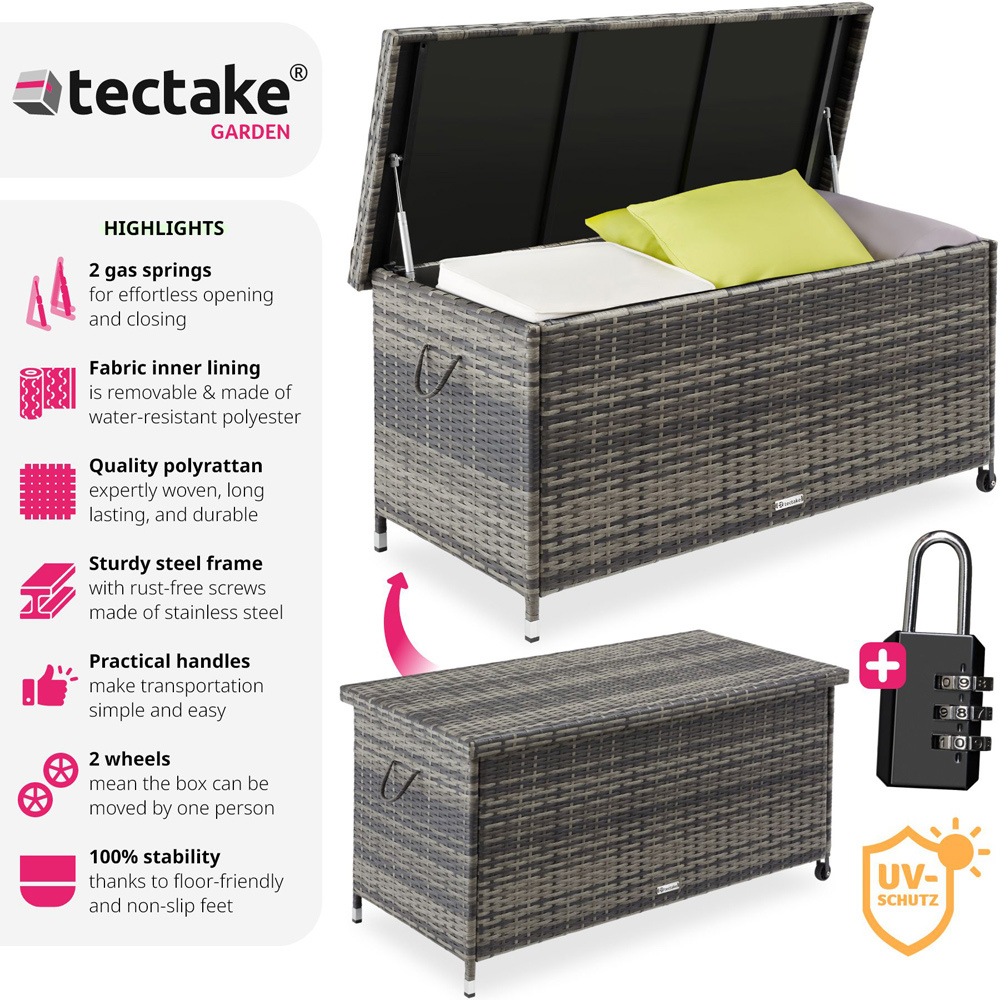 With its large storage space, the practical garden storage box Kiruna from tectake is an ideal addition to any outdoor area. Under the reinforced cover there is a lockable inner pocket that keeps out dust, dirt and moisture and can be additionally closed with the supplied combination lock for extra security. The box's two handles and two castors make it easy to move the compact construction with a sturdy steel frame. Stylishly encased by natural-looking wickerwork made of hard-wearing plastic poly rattan, the versatile storage chest can be easily integrated into any garden setting and alongside other pieces of furniture. Store cushions, tools and other home products with the spacious garden storage box Kiruna from tectake. Dimensions: 120 x 55 x 61.5cm.