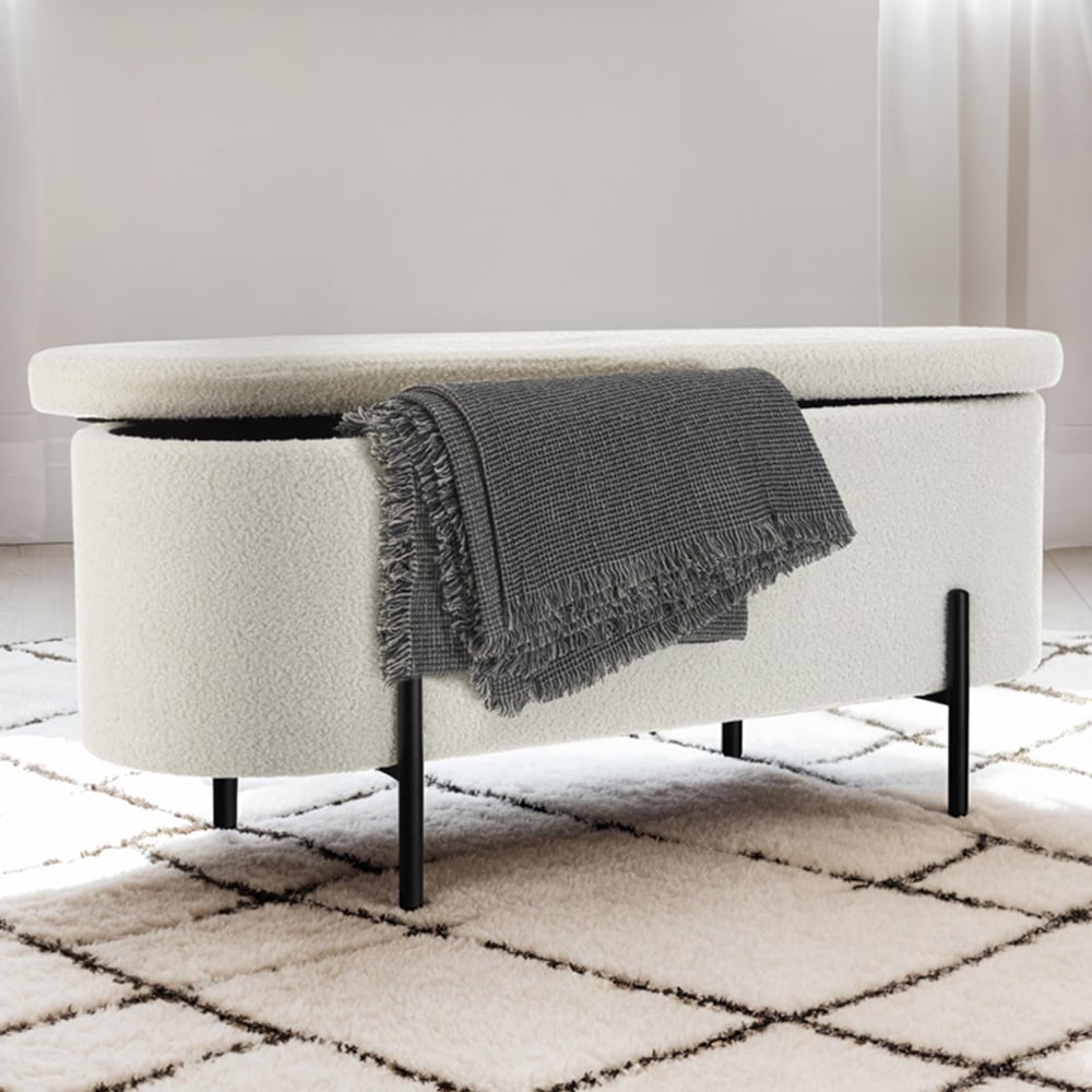 Elevate your home's functionality and style with the Hallway Bench Lanja, a perfect blend of comfort and practicality in a Scandi-style design. This upholstered bench features plush boucle fabric and slim, elegant legs that seamlessly integrate into any room, be it your hallway, dining area, or living room. It's not just about looks; the high-density foam filling offers a comfortable seat while the sturdy steel supports ensure durability. The innovative design includes a storage space under the seat, making it an ideal solution for keeping your space tidy and organised. Whether you're putting on shoes or need extra seating, this cushioned bench with built-in storage is an excellent choice for any modern home. Dimensions: 97 x 36 x 42cm.