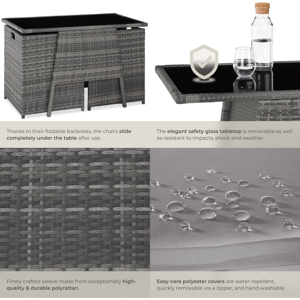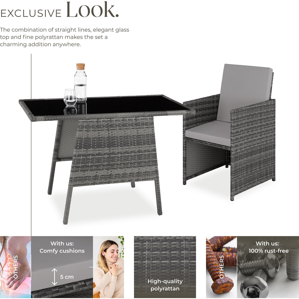 Enhance your outdoor experience with the Rattan Garden Furniture Set Lausanne. Upgrade your outdoor living space with the stunning Rattan Garden Furniture Set Lausanne. This elegant garden furniture set, designed specifically for two people, marries chic aesthetics with functional utility, making it an ideal choice for creating a cosy, stylish nook in your garden or patio. The Rattan Dining Chairs included in the Lausanne set offer unbeatable comfort and support. Crafted with high backs, these chairs ensure optimal spine support, enhancing the relaxation experience. Their lightweight design, complemented by practical handle cutouts on the backrests, allows for easy mobility and arrangement. Whether enjoying a quiet evening outdoors or hosting a small dinner, these chairs are built to elevate the dining experience. The Lausanne garden furniture set is perfect for those seeking versatility and durability. Constructed with a robust steel frame and stainless steel screws, this set is designed to withstand various outdoor conditions. The furniture's UV-resistant and weatherproof properties ensure long-lasting use, maintaining its pristine look throughout the seasons. The table features a detachable glass top, offering ample space for dining or lounging, and can be easily cleaned and stored. One of the standout features of the Lausanne garden table and chairs is their space-saving design. Ideal for smaller balconies or terraces, the chairs can be conveniently folded and stored under the table to form a compact, easily storable unit. This innovative design ensures that outdoor space can be maximised without sacrificing style or comfort. The rattan garden furniture in this set exudes a modern look that seamlessly integrates with nearly any outdoor decor. The meticulously crafted polyrattan weave offers style and resilience, making it a valuable addition to any home. The included cushions, featuring durable polyester covers, are water-repellent and can be easily removed for washing thanks to the handy zippers. Stylish design: the sleek, modern design of the Lausanne set enhances any outdoor setting. Comfortable seating: high-backed chairs with removable cushions provide superior comfort. Durable construction: robust steel frame and weatherproof materials ensure longevity. Space-saving: foldable chairs and stackable table for easy storage. Easy maintenance: detachable glass table top and washable cushion covers for hassle-free upkeep. Transform the outdoor area with the Rattan Garden Furniture Set Lausanne. Perfect for intimate gatherings or leisurely afternoons, this set combines elegance, comfort, and practicality. Shop now and enjoy fast delivery straight to the home. Enhance outdoor living with the Lausanne garden furniture set. Order today and experience the perfect blend of style and functionality.
