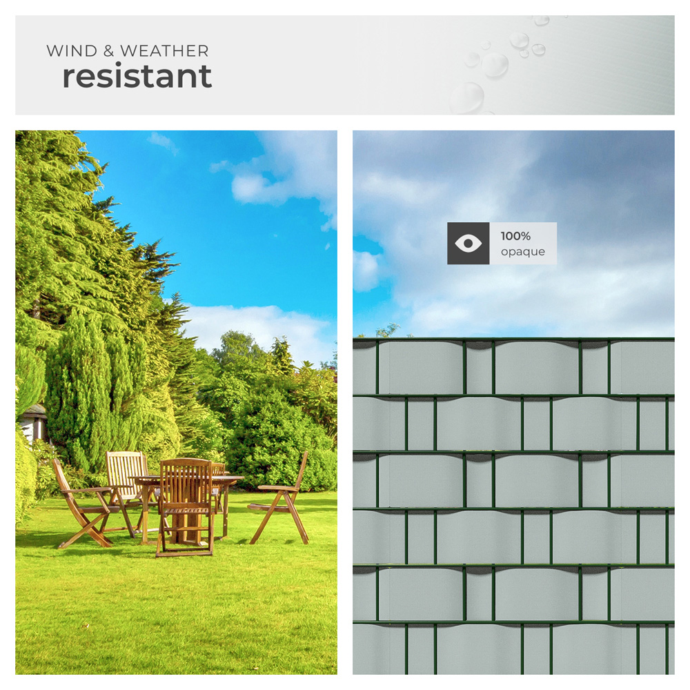 Enhance your outdoor space with the versatile and high-quality privacy film from tectake. Designed to offer protection from the sun, wind, and weather, this privacy screen also provides noise reduction and ensures added privacy. Perfect for all common single and double-stick mat fences, it is easy to install in just a few simple steps. The film is printed on both sides, UV-resistant, and low in reflection, with a double-sided coating to prevent colour fading over time. For easy maintenance, simply rinse it off with a garden hose. To install, simply thread the privacy film through your fence's bars and secure it with the included attachment clips. The decorative vinyl films can be cut to fit your fence and come in a range of matching decorative designs. Each vinyl design creates a unique effect and helps improve the privacy and safety of your home. They also cut direct UV light to your home, helping keep solar energy and heat away when needed. Ideal for creating a more private and comfortable outdoor environment.