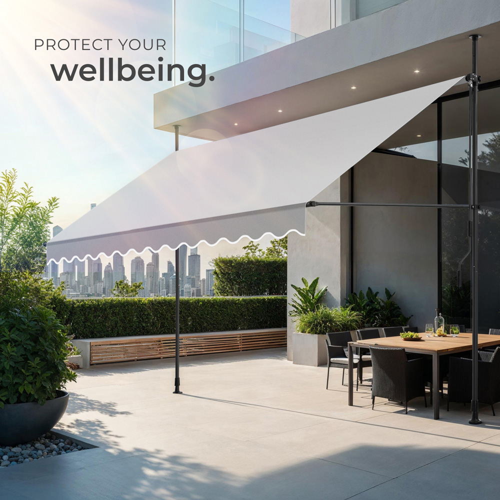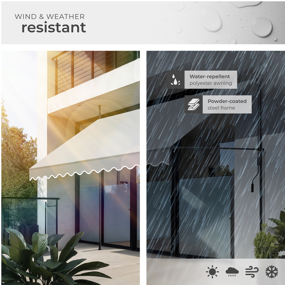 This manual awning provides protection from the sun and rain, making your patio, garden, or outdoor area more useful whatever the weather. Key features include a smooth-running hand crank, and UV and rain resistance. Plus, as it is constructed from powder-coated steel, aluminium, and polyester fabric, it is built to last. Compared with other awnings and similar products, installation of this home awning is done using a simple clamp system and requires no drilling into exterior walls. Enjoy the flexibility of a retractable patio canopy, which allows you to effortlessly bask in the sun's warmth or take shelter in the cool shade. Enhance your outdoor space with the retractable awning from tectake, perfect for a patio door, window, or as a roof extension. This easy-to-install awning requires no drilling and provides excellent sun protection with its durable fabric canopy. Adjustable for the ideal shade, it is perfect for windows or roofs or to add style and practicality to your outdoor area. Shop now for a versatile awning that brings comfort and protection.