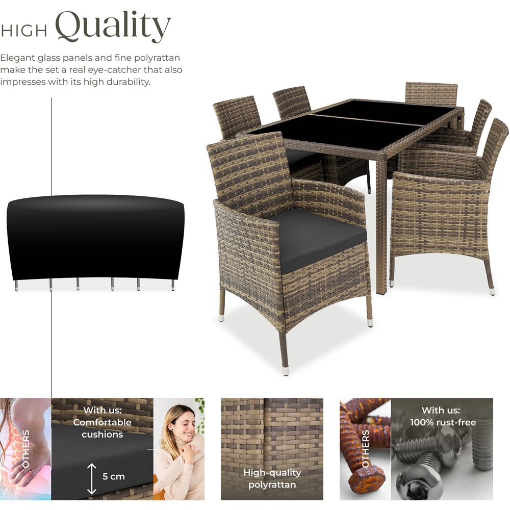 This six seater, polyrattan chair set from tectake is perfect for all your outdoor dining needs. The polyrattan material used has been specifically designed for garden furniture, as it is weather-resistant and highly durable. Polyrattan is the overarching term for artificially produced weaved materials made of polyethene, which represent an industrially produced alternative to natural rattan. Your new seating chairs and table set are thus washable, easy to care for, and weather-resistant. The cream-coloured upholstered cushions are water-resistant, removable and easy to clean thanks to the incorporated zippers. The table features a hardened glass plate which is painted black on the bottom and guarantees an elegant appearance. The included rain cover provides additional protection so that you may enjoy your great chair set for years to come. Order this fantastic polyrattan chair set from tectake today and turn your patio or decking into the ultimate, outdoor dining room.