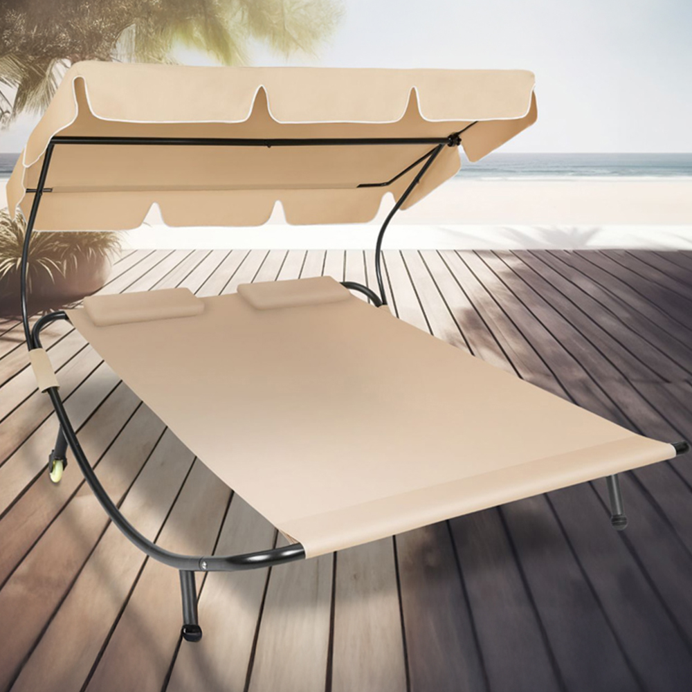 The luxurious sun lounger for two people from tectake is the most comfortable way for relaxing hours in your garden. Whether you just want to get lost in thought or relax as a couple or with a friend. The sun lounger is suitable for indoor and outdoor use and is easily movable thanks to its rear wheels. The sturdy metal frame of the sun lounger supports up to 200kg. Due to the easy care liquid repellent coating of the textile, the sun lounger is very easily kept free of dirt. This double sun lounger comes with an extra large sun shade which ensures shady and cool relaxation even when the sun is pounding down. Get ready for summer with this double sun lounger from tectake.