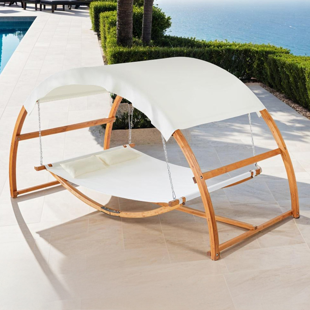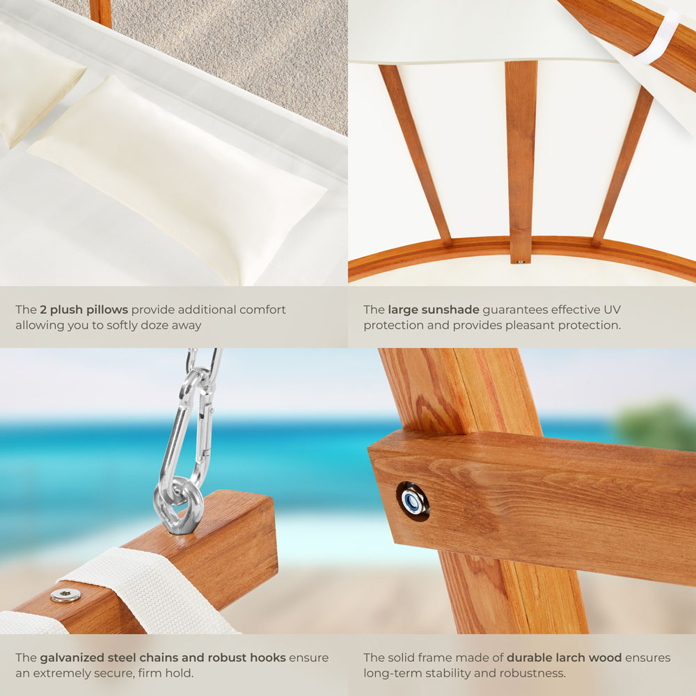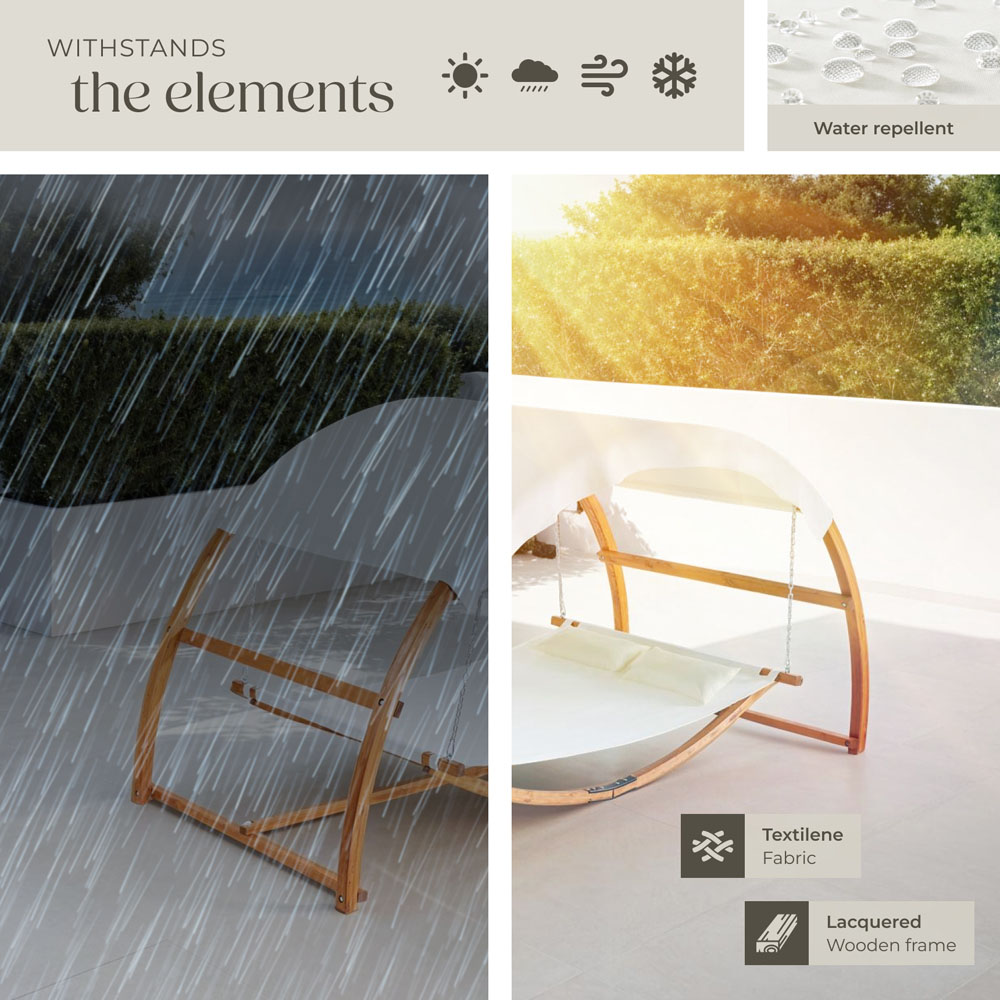 With the Locarno double hammock and stand from tectake, you can relax in your garden as a single person, as a pair, or as a family. The hanging bed frame ensures both stability and a high load capacity, compared with other hammocks or even a swing chair, plus the high-quality wooden hammock frame is robust and will withstand both use by the whole family and the British weather. The lying surface of the hanging hammock product is made of durable Textilene fabric, which is breathable, ensures the hammock chair dries quickly and is easy to care for. For extra comfort, two pillows with polyester covers are included with these hammocks. The hammock lounger also impresses in terms of safety, hanging from galvanised steel chains and hooks, the double hammock is securely attached to the frame and stand. This allows you to lean back and relax without worry as a single hammock user or a pair. Equipped with a large sun canopy, the swing stand provides effective protection and creates pleasant shade for a relaxing break in the garden. Also easy to use and install with a regular garden chair. The hanging Locarno hammock with stand from tectake is the perfect alternative for anyone who wants more than an ordinary garden chair or regular lounge chairs.