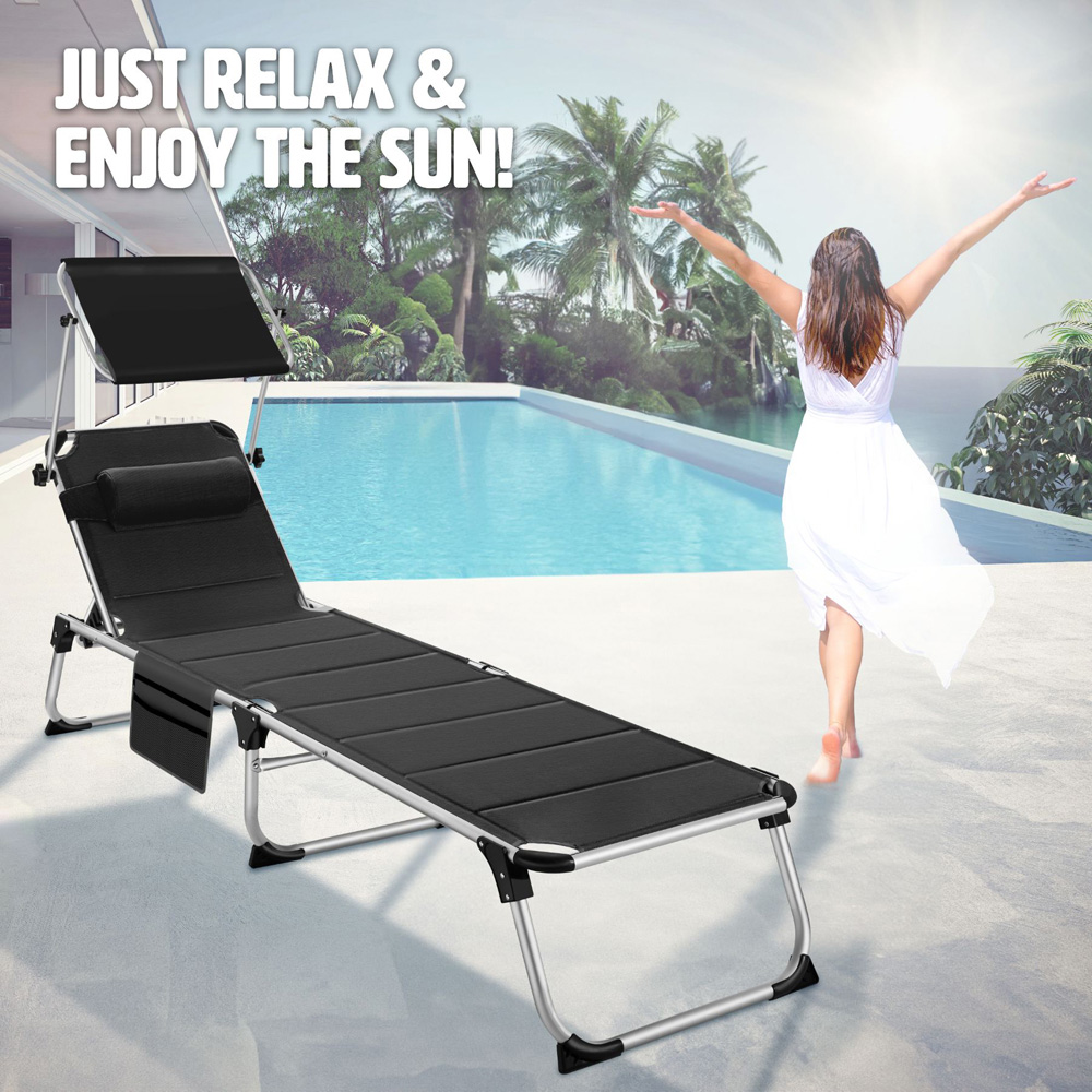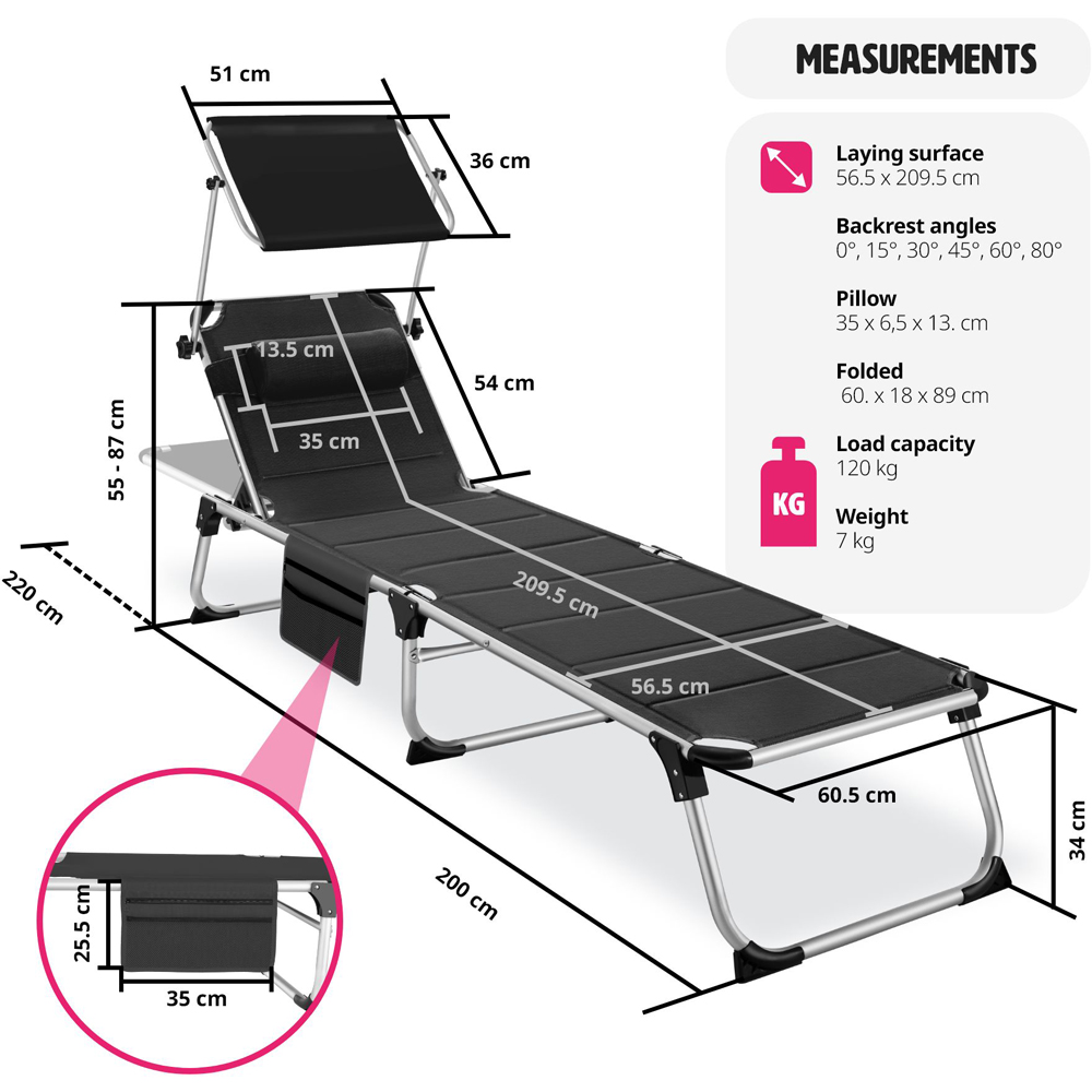 On the cleverly designed tectake Lorella Black Foldable Aluminium Frame Sun Lounger, you can enjoy the summer to the fullest. The loungers breathable padded lying surface, the cosy, removable headrest and the practical side pocket guarantee maximum comfort. The garden furniture features a solid aluminium frame which is absolutely weatherproof, making the outdoor chair easy to care for and resistant to the British summer. The lounge chairs robust, water-repellent synthetic fibre surface further adds to it's overall weather-resistance. Thanks to the continuously adjustable sun canopy, flexible backrest with six inclination angles and two carrying handles, the lightweight folding sun lounger Lorella offers you a completely individual relaxation experience from the comfort of your own home - wherever and however you want.
