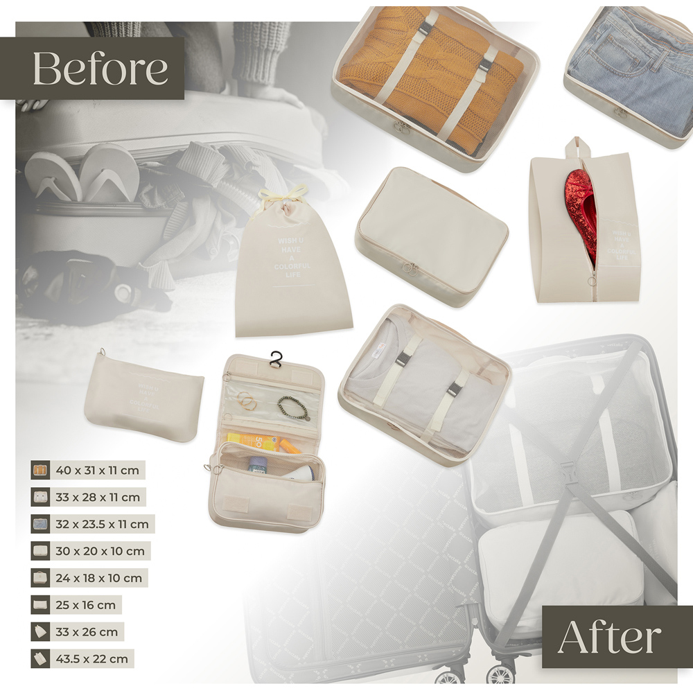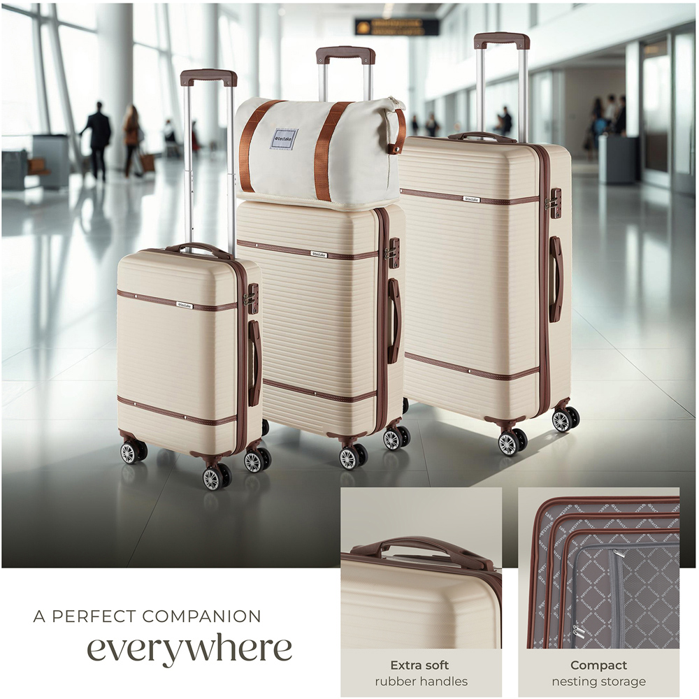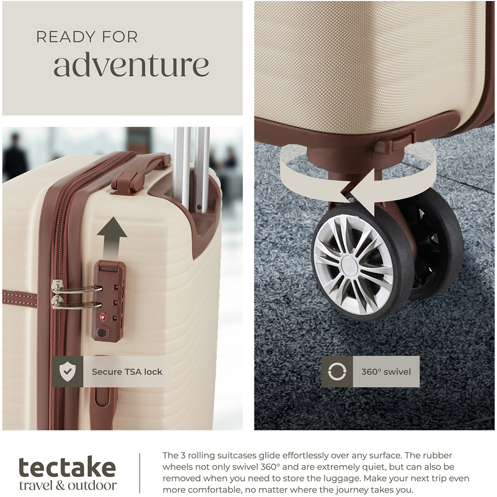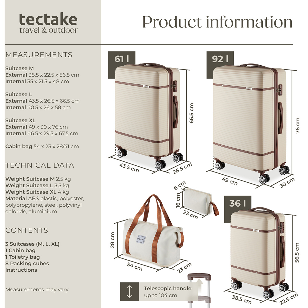 This 13-piece luggage set by Tectake is the perfect choice for your next travel adventure. This set includes everything you need, with durable suitcases and accessories designed for maximum convenience. The hard shell suitcase construction and TSA lock ensures your belongings stay safe and secure. This luggage set offers a combination of style, functionality, and durability. Whether you're heading on a business trip or a family vacation, the suitcases are spacious, easy to handle, and ready for any journey. Travel in comfort and style with this essential set of luggage! With this hard-shell suitcase set, you are optimally equipped – whether for a weekend trip or a long holiday. The luggage set allows you perfect organisation thanks to its extensive accessories. The three hard-shell suitcases can be stacked inside each other to save space and each has tension straps and a divider with a mesh pocket inside. The practical travel bag scores with a storage expansion that can be used with a zip and with smaller compartments both inside and outside. To make a sprint at the station or airport easier, it can also be placed on the telescopic handles of the suitcases. The 8-piece packing cube set and the spacious toiletry bag ensure that you always keep track of your contents on the go. The ABS hard-shells make the suitcase set particularly impact, scratch and weather resistant. In addition, the solid TSA locks offer reliable protection against unauthorised access, while they can still be easily opened by customs personnel, for example, and do not need to be broken open. Whether on a plane or on bumpy roads – your belongings are well protected in these rolling suitcases. Stylish accents in leather look give the design a high-quality touch and additionally, side feet guarantee stability when briefly placing the suitcases down. Thanks to the removable, 360° rotating wheels, the trolleys glide effortlessly and quietly over any surface. The ergonomic handles and the three-stage adjustable telescopic mechanism ensure super comfortable handling - Flexibility, safety and comfort: Enjoy relaxed travel with the high-quality Madison rolling suitcase set from Tectake.