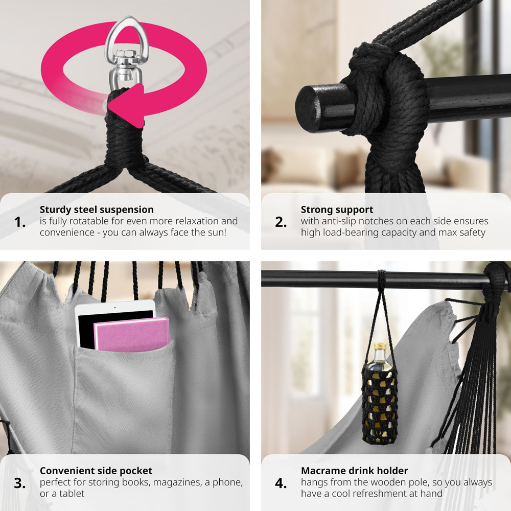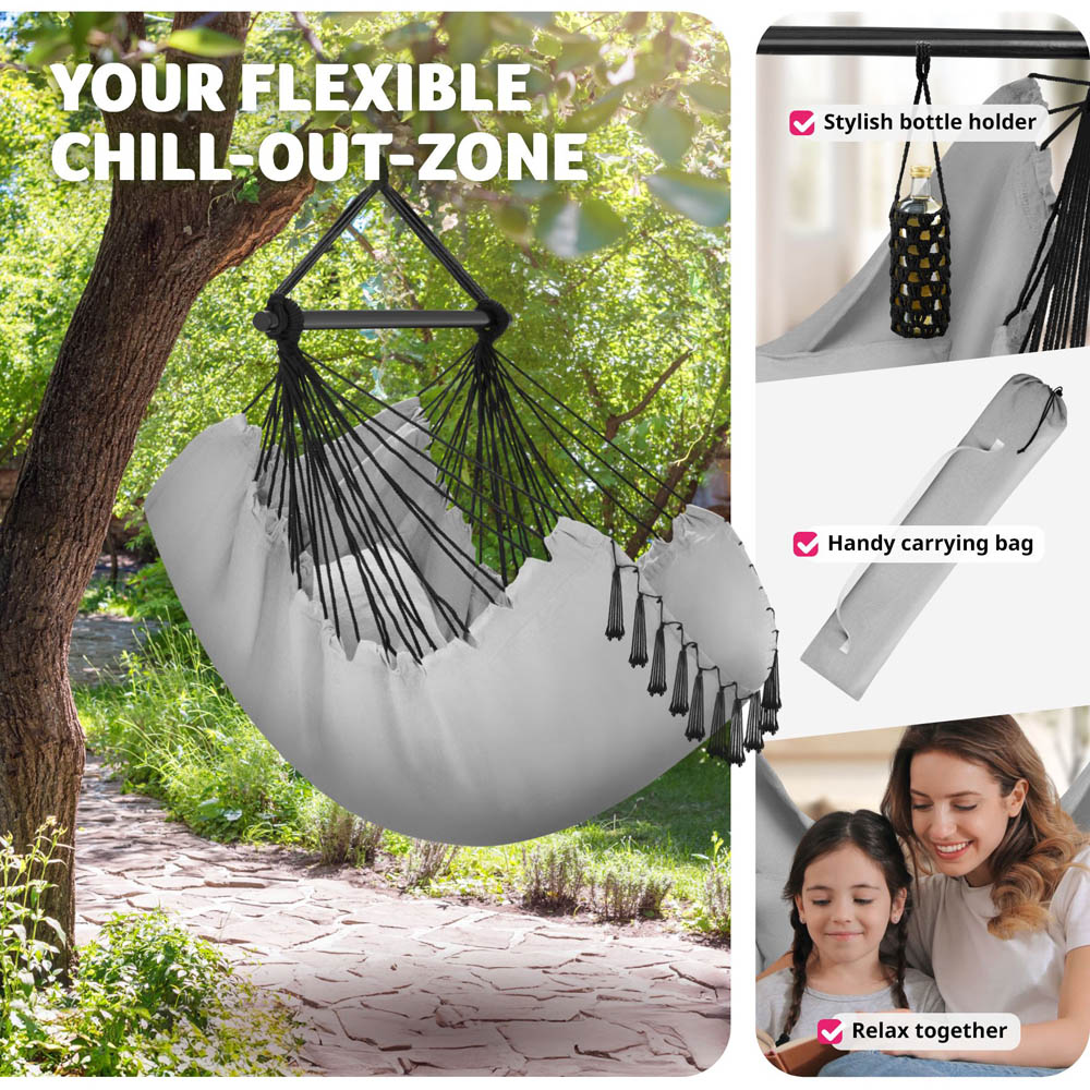 In the cosy tectake Malika Grey Hanging Chair 150kg, you can gently swing into relaxation thanks to the extra thick seat and back cushions. The fully rotatable hanging seat in modern Boho style with long decorative tassels is also practical. It includes a book compartment and a drink holder, so you always have reading material and a cool refreshment at hand. The chair, which can hold up to 150 kg, is hung on a solid wooden pole with side anti-slip notches, while the included carrying bag makes transport and storage easier. Get yourself the ultra-comfortable Malika hanging basket, suitable for indoor and outdoor use, now as a cosy element for your living room, balcony, or terrace.