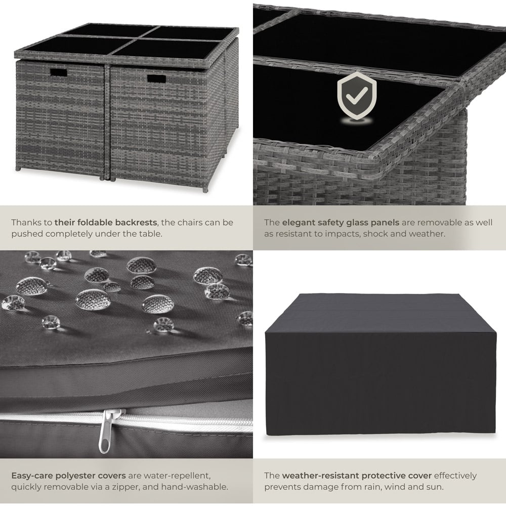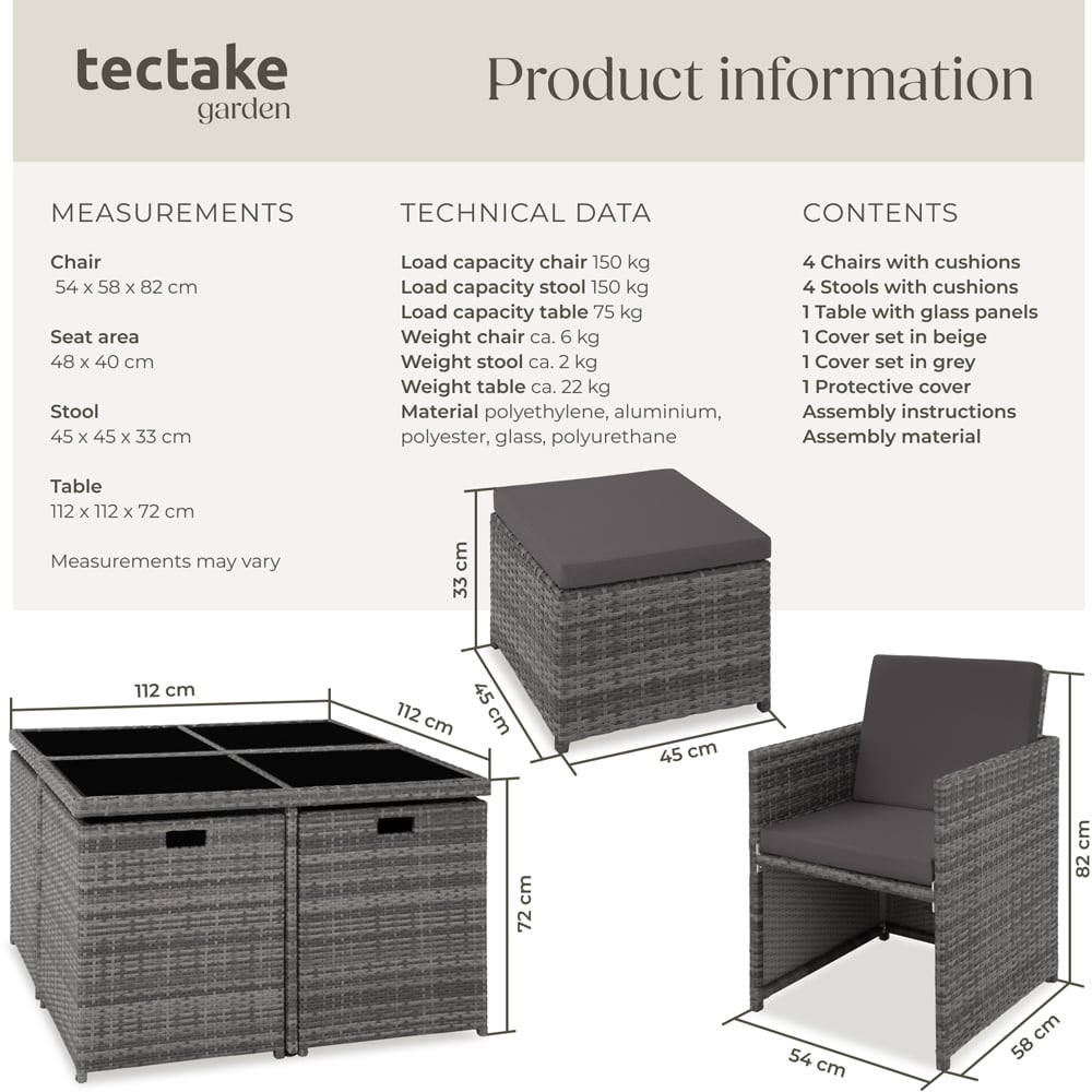 Transform your garden into a stylish and comfortable retreat with the New York garden furniture set from tectake. This elegant outdoor set includes a large dining table, 4 comfortable chairs, 4 stools, thick cushions and a rain cover, making it perfect for relaxing or hosting meals with friends and family. The set's rattan construction is not only durable but also stylish, offering the perfect blend of function and fashion for your garden. The grey or beige cushion covers add a sophisticated touch and make maintenance simple and convenient. The set's rattan-look dining table and outdoor garden furniture pieces offer excellent comfort, whether you're lounging or dining outdoors. The spacious outdoor table provides ample room for meals, drinks, and more, while the included storage options help keep your accessories organized. Ideal for any patio, balcony, or garden seating area, the Manhattan garden furniture set is designed for durability and style. Shop now and add this garden furniture set to your outdoor space for the perfect blend of elegance and functionality.