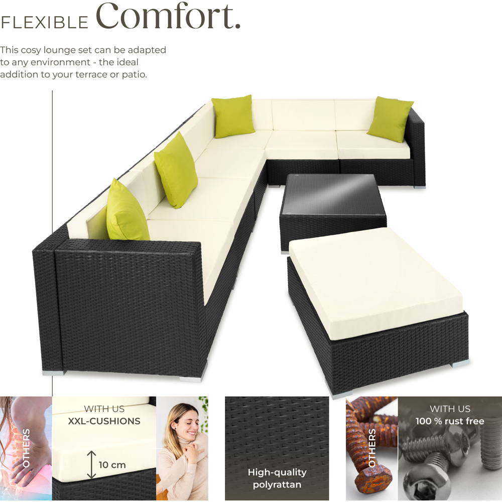 Garden Furniture Marbella offers high-quality rattan dining chairs set for outdoor lounging. Experience unmatched outdoor luxury with this exquisite rattan garden furniture set designed to bring a touch of elegance to your garden, balcony, terrace, or winter garden. Crafted with high-quality materials, this set not only serves as a stunning addition to your outdoor space but also offers the ultimate comfort and durability. The Marbella set includes plush, removable seat cushions with a thickness of approximately 10 cm, ensuring optimal comfort for you and your guests. The set also features four additional cushions, making it a perfect spot for relaxation or entertaining. Constructed with an aluminium frame, this garden furniture set is both lightweight and robust, providing a stable foundation for outdoor enjoyment. The seating capacity accommodates 6 to 7 people, making it ideal for gatherings of friends and family. The centrepiece of this garden furniture set is the dining table with a sleek glass surface. This rattan garden table not only enhances the modern aesthetic of your outdoor space but also offers practical benefits. The glass top is easy to clean and can be removed if needed, making it versatile for different occasions. Whether enjoying a quiet morning coffee or hosting a dinner party, this table is designed to meet all dining needs. One of the standout features of the Marbella garden furniture set is its weather-resistant and UV-stable properties. Made from high-quality polyrattan, this set is built to withstand diverse weather conditions, ensuring that it remains a beautiful and functional part of your outdoor space all year round. The aluminium frame further ensures that the furniture is rust-resistant and long-lasting. Whether setting up an outdoor lounge or a comfortable dining area, the Garden Furniture Marbella is a versatile choice. Its natural and elegant design seamlessly blends with any home style, adding a glamorous flair to your terrace, winter garden, or large balcony. The set also includes a flexible stool, which can extend the seating area of the chairs or be used as a footrest, making it a practical addition to your outdoor furniture collection. At the shop, high-quality garden furniture that meets the highest standards of comfort and design is offered. Discover the perfect blend of style, comfort, and durability with the Garden Furniture Marbella, and transform your outdoor space into an elegant haven of relaxation and enjoyment.