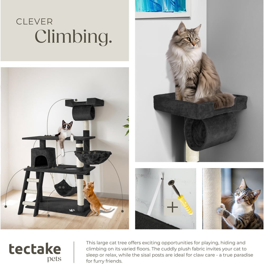 Your cat will love this beautiful and practical cat tree. The scratching posts offer optimal ways to play and sharpen claws whilst the cat cave can be used as a retreat. Your kitten can reach his or her cave on the first level via the stairs. Right next to the cave there is a hanging toy cord, perfect for attacking and playing with. Your cat will also find a hole on the first floor to reach the comfortable hanging hammock. The round hammock that is set slightly higher is the perfect place to hang out and nap. Above the large second floor where your cat can really stretch out, there is a tube which your cat will love to climb into. Finally comes the observation deck at the top at 141cm. From there, your cat can casually observe the entire home room, satisfying their natural curiosity. Your pet can sharpen their claws on the hard-wearing mixed posts that consist of a plush-sisal combination. All in all, this is a very extensive cat tree that leaves no cats desires unfulfilled, but is still small enough to not dominate the room.