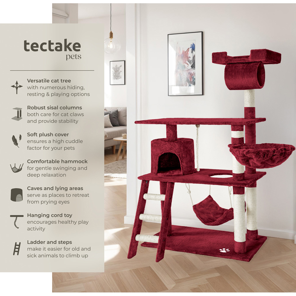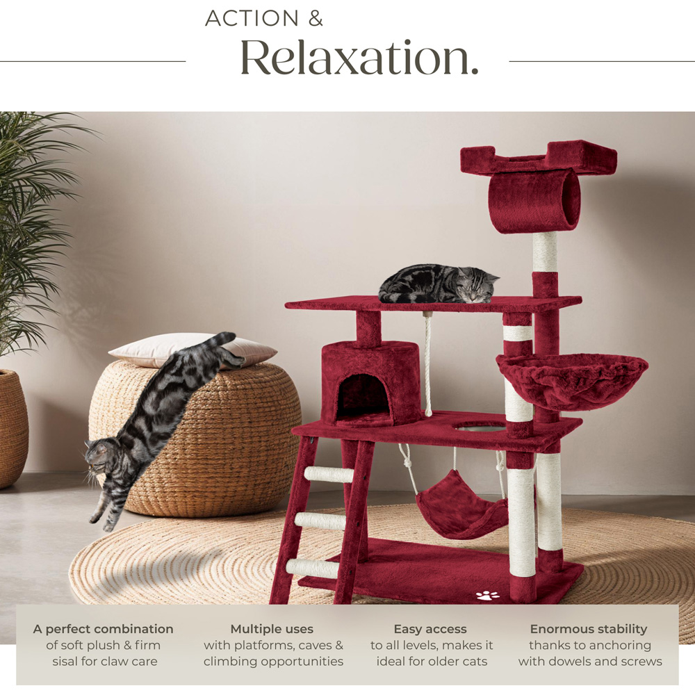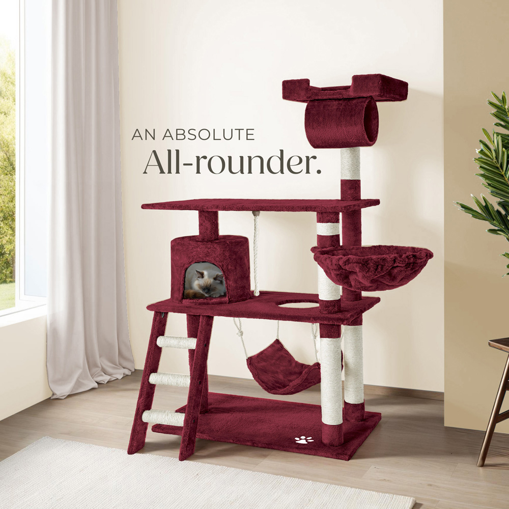 Your cat will love this beautiful and practical cat tree. The scratching posts offer optimal ways to play and sharpen claws whilst the cat cave can be used as a retreat. Your kitten can reach his or her cave on the first level via the stairs. Right next to the cave there is a hanging toy cord, perfect for attacking and playing with. Your cat will also find a hole on the first floor to reach the comfortable hanging hammock. The round hammock that is set slightly higher is the perfect place to hang out and nap. Above the large second floor where your cat can really stretch out, there is a tube which your cat will love to climb into. Finally comes the observation deck at the top at 141cm. From there, your cat can casually observe the entire home room, satisfying their natural curiosity. Your pet can sharpen their claws on the hard-wearing mixed posts that consist of a plush-sisal combination. All in all, this is a very extensive cat tree that leaves no cats desires unfulfilled, but is still small enough to not dominate the room.