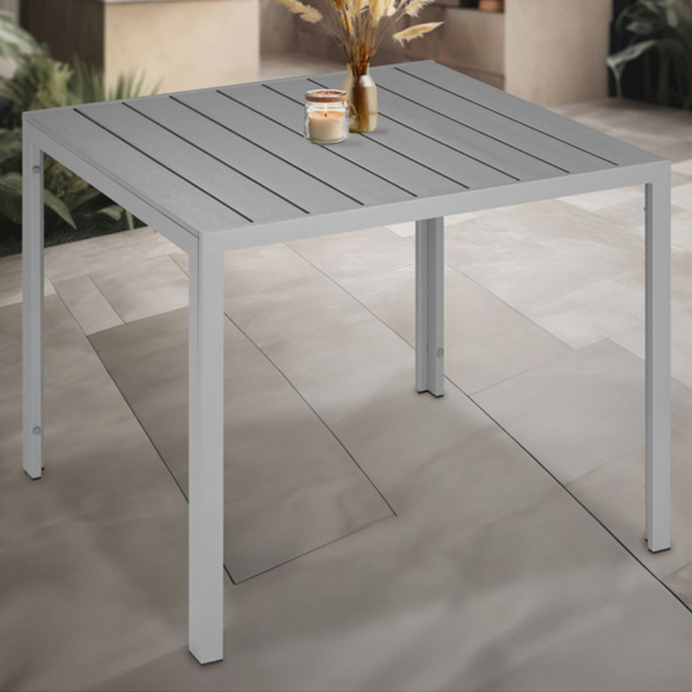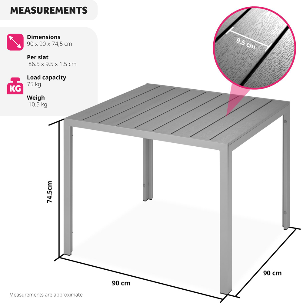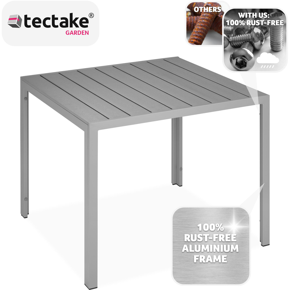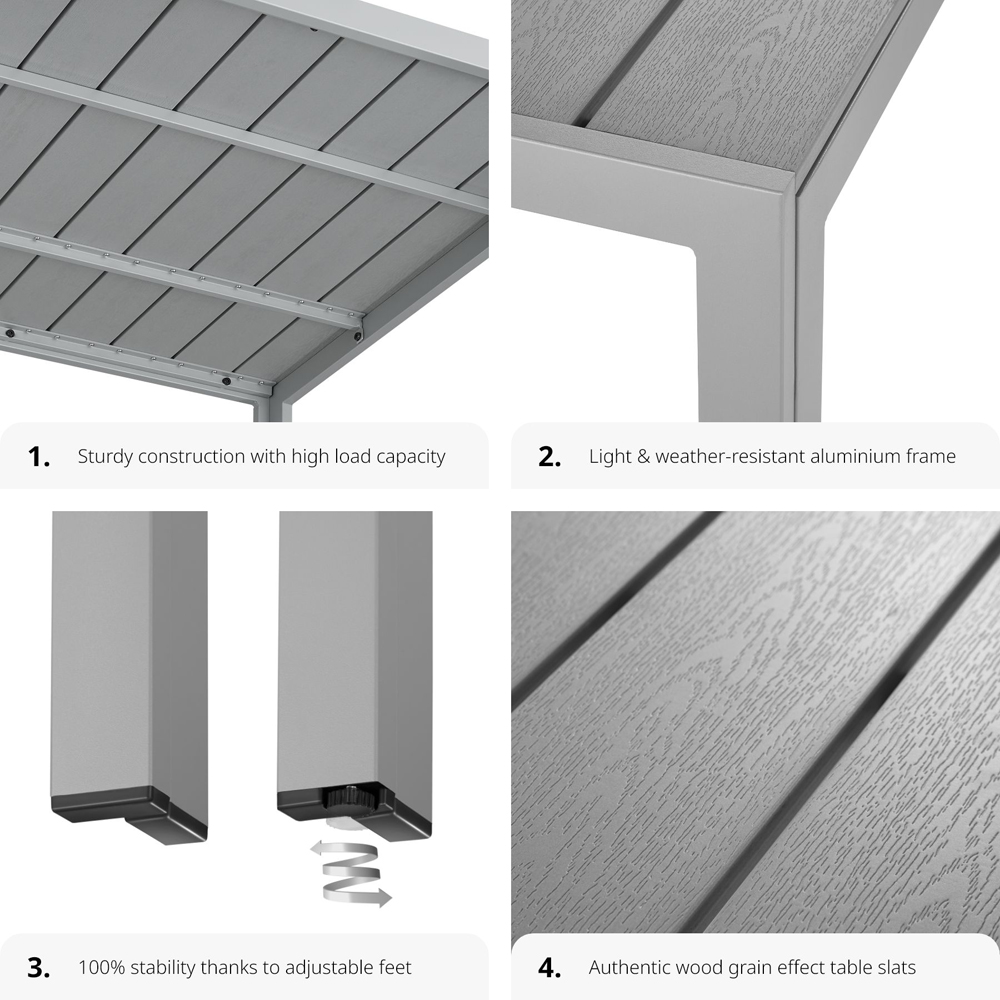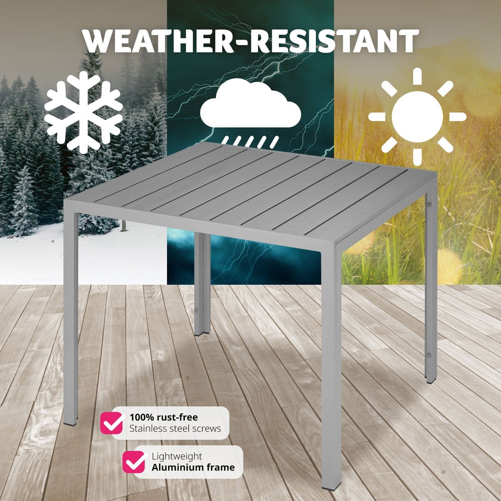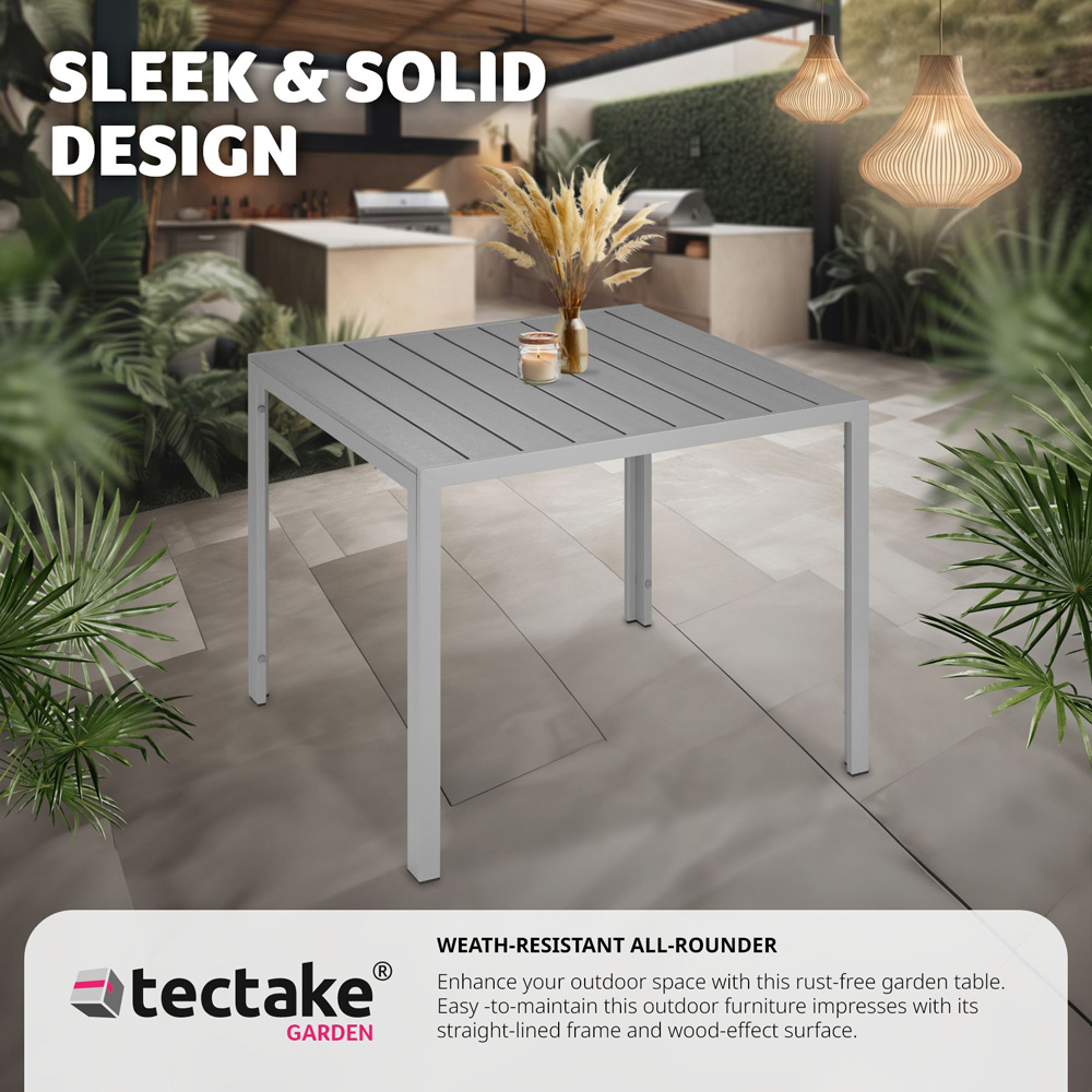Elevate your outdoor dining experience with the tectake Maren Silver Aluminium Garden Table. This extraordinary small garden table is crafted to combine both durability and style, making it the perfect addition to any outdoor space. Whether you're hosting a summer BBQ or enjoying a peaceful morning coffee, the Garden Table Maren is designed to meet all your needs. Built to withstand the elements, the Garden Table Maren features a sturdy, rust-free aluminium frame that ensures long-lasting durability. The aluminium and plastic construction makes this outdoor table incredibly lightweight, allowing for easy movement and rearrangement. Its weather-resistant and UV-stable properties mean it can handle the harshest of conditions, from scorching summer heat to heavy downpours, without showing signs of wear. The Garden Table Maren is not just about strength; it's also about style. The table surface is adorned with panels that mimic the look of natural wood, offering a modern and sophisticated appearance. This unique design element makes the Garden Table Maren a standout piece of furniture that seamlessly blends with any outdoor decor.