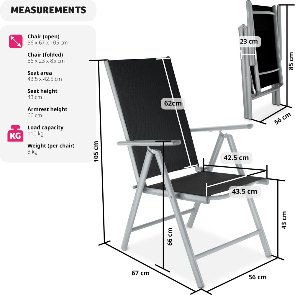 This elegant folding garden chair with a high back from tectake is perfect for enjoying a relaxing evening in your outdoor space, be it in the garden, on the terrace or on the balcony. The outdoor dining chair's synthetic mesh fabric is durable, optimally adapts to the body and provides good ventilation while sitting. The metal framed back rest can be adjusted in 7 angles, whilst the chair can be completely collapsed for space-saving storage design. In addition, the chair is very light as a result of the base frame which is made of aluminium. Alongside other furniture like a garden table and extra accessories like solar lamps, you can convert your outdoor space into the ultimate open-air kitchen and enjoy a fresh dining experience from the comfort of your own home. These chairs are available in sets of various quantities so find the one which suits you best. Search no further for the perfect chairs to complement your garden table and complete your dining set, these aluminium garden chairs from tectake are sure to impress.