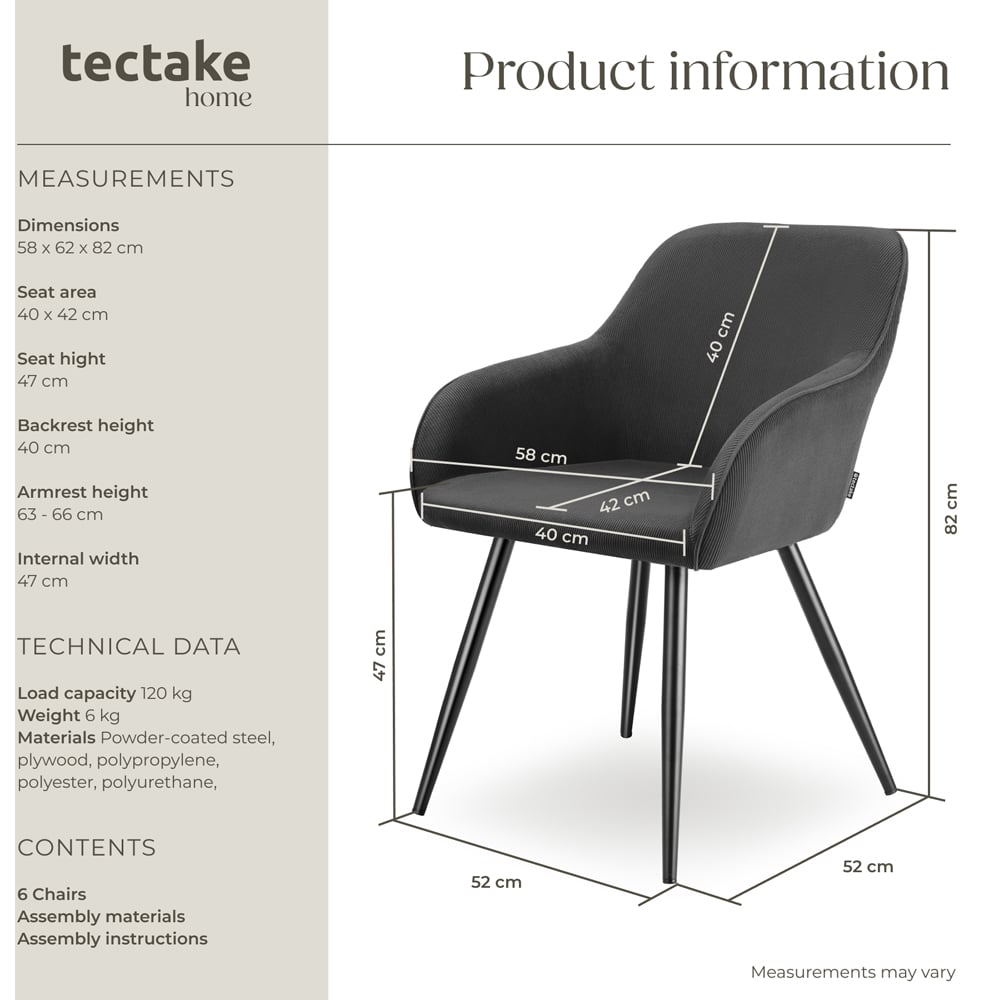 Add a touch of sophistication to your home with the Marilyn dining chair with cord cover from tectake. This elegant dining chair combines modern design with an extremely comfortable seating experience, perfect for any office or living room. The ergonomic design of the chair's large seat shell with continuous arm and backrest, plus the comfortable padding allows you to sit comfortably even during long dinner parties. The slim, powder-coated steel legs of the furniture not only impress with their high load-bearing capacity and fantastic stability but also complete the look. Thanks to floor-friendly, non-slip plastic feet, your wood floors will be safe. Make your dining room an exclusive focal point with the easy-care Marilyn upholstered dining chair with corduroy cover from tectake, the perfect combination of style and comfort. Elevate your space with the Dining Chair Marilyn, featuring a luxurious corduroy-look fabric and plush upholstery. With its continuous backrest and integrated armrests, this chair offers both style and exceptional comfort, making it perfect for your dining room, living room, or office. Crafted for modern elegance, this versatile furniture piece complements any table setup, whether in your home or workspace. Add a touch of sophistication to your decor with these beautifully designed chairs, perfect for any room.