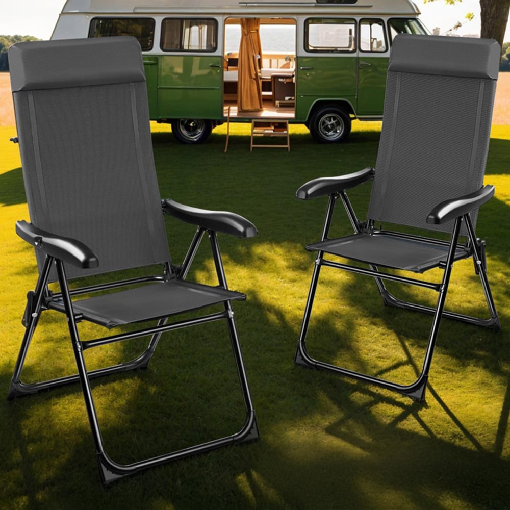 The folding Muritz camping chairs are easy to transport, long-lasting, and comfortable. Lightweight, offering seven reclining positions, a built-in headrest, and a 120 kg load capacity, each chair is perfect for a day out at the beach, sleeping in the garden, or camping in the countryside. There's even a built-in hook on the right armrest to hang bags or other accessories. Whether having an outdoor adventure, camping, at festivals, or on a motor home holiday, these pre-assembled fold-away camping chairs offer maximum comfort with minimal effort. The Muritz camping chairs are practical and comfortable as the furniture can be adjusted to seven different angles, so you always find the perfect seating position. Plus, the ergonomic armrests and the thickly padded, removable headrest provide additional comfort. With a handy folding mechanism, the camping chairs are folded and ready for transport in seconds and can easily fit into a small car boot, along with bags, tents, camping tables, picnic baskets, or other accessories. The frames are plated in rust-free aluminium to ensure longevity and the Textilene fabric is robust and water-repellent, making each chair ideal for use in changeable weather. The non-slip plastic feet caps ensure that you sit securely even on uneven ground, keeping kids safe. Get a folding Muritz camping chair now and enjoy comfort and functionality on your next outdoor beach adventure.