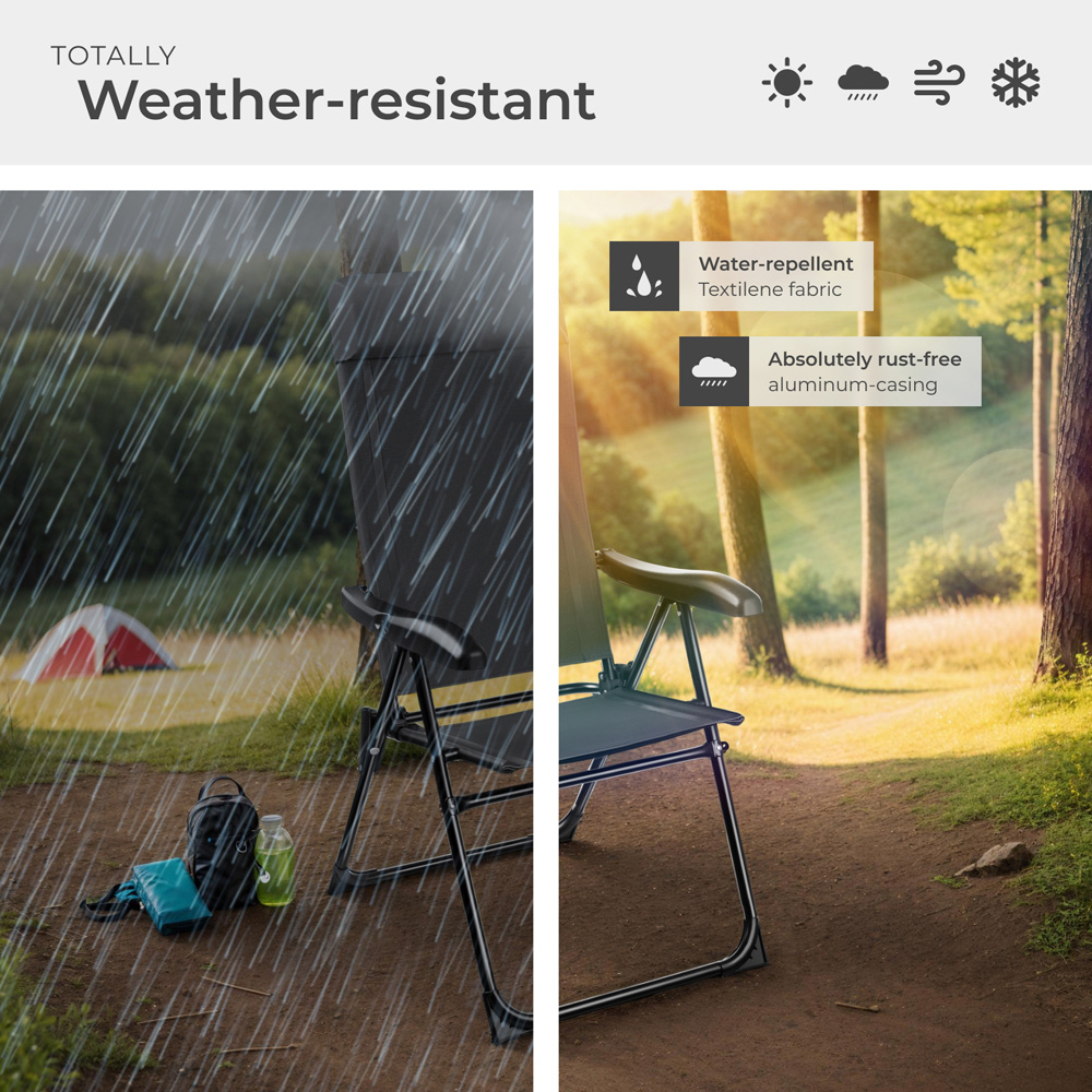The folding Muritz camping chairs are easy to transport, long-lasting, and comfortable. Lightweight, offering seven reclining positions, a built-in headrest, and a 120 kg load capacity, each chair is perfect for a day out at the beach, sleeping in the garden, or camping in the countryside. There's even a built-in hook on the right armrest to hang bags or other accessories. Whether having an outdoor adventure, camping, at festivals, or on a motor home holiday, these pre-assembled fold-away camping chairs offer maximum comfort with minimal effort. The Muritz camping chairs are practical and comfortable as the furniture can be adjusted to seven different angles, so you always find the perfect seating position. Plus, the ergonomic armrests and the thickly padded, removable headrest provide additional comfort. With a handy folding mechanism, the camping chairs are folded and ready for transport in seconds and can easily fit into a small car boot, along with bags, tents, camping tables, picnic baskets, or other accessories. The frames are plated in rust-free aluminium to ensure longevity and the Textilene fabric is robust and water-repellent, making each chair ideal for use in changeable weather. The non-slip plastic feet caps ensure that you sit securely even on uneven ground, keeping kids safe. Get a folding Muritz camping chair now and enjoy comfort and functionality on your next outdoor beach adventure.