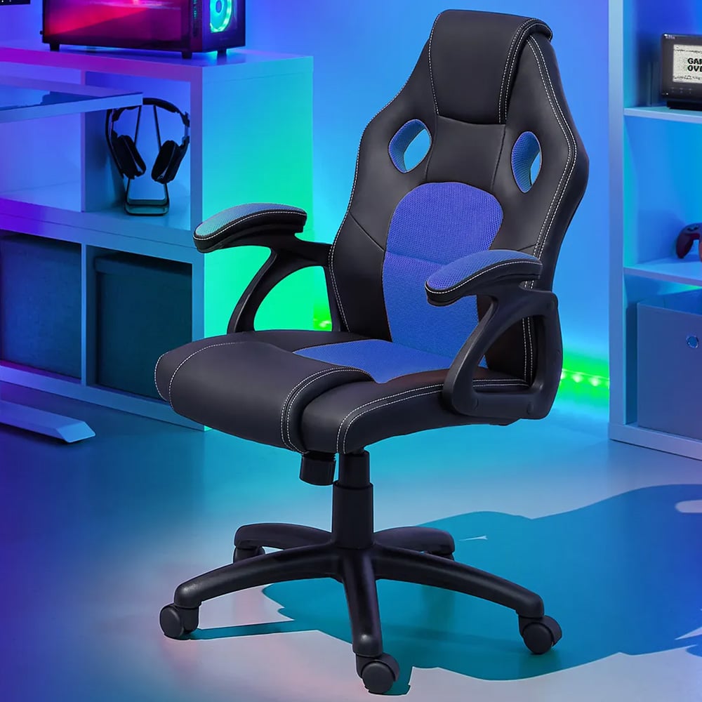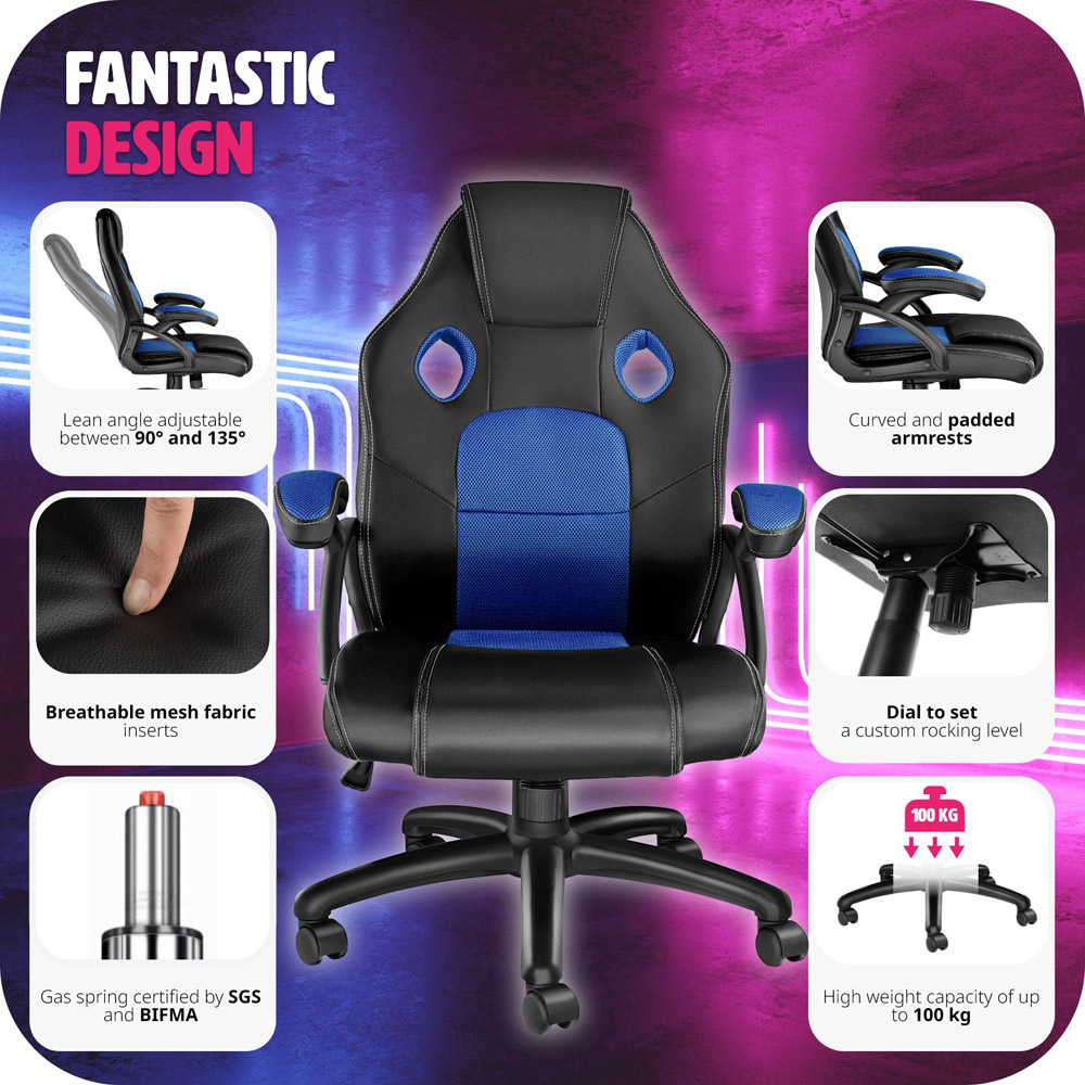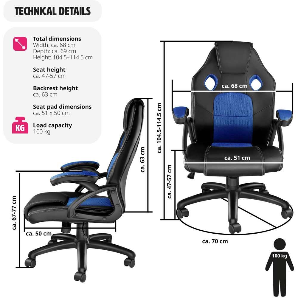 In this ergonomically shaped gaming chair from tectake, with its flowing lines, back support and comfortable padding, you'll be sure to finish in first place. Breathable mesh inserts wick moisture away whenever working or gaming brings you out in a sweat. The robust base of this swivel chair guarantees exceptional stability, while the abrasion-resistant double castors glide easily over the floor. The plastics used give the construction its impressive durability and make using this racing chair from tectake a unique experience. Perfect for the home and office environments, this gaming chair helps you complete work and gaming tasks efficiently.