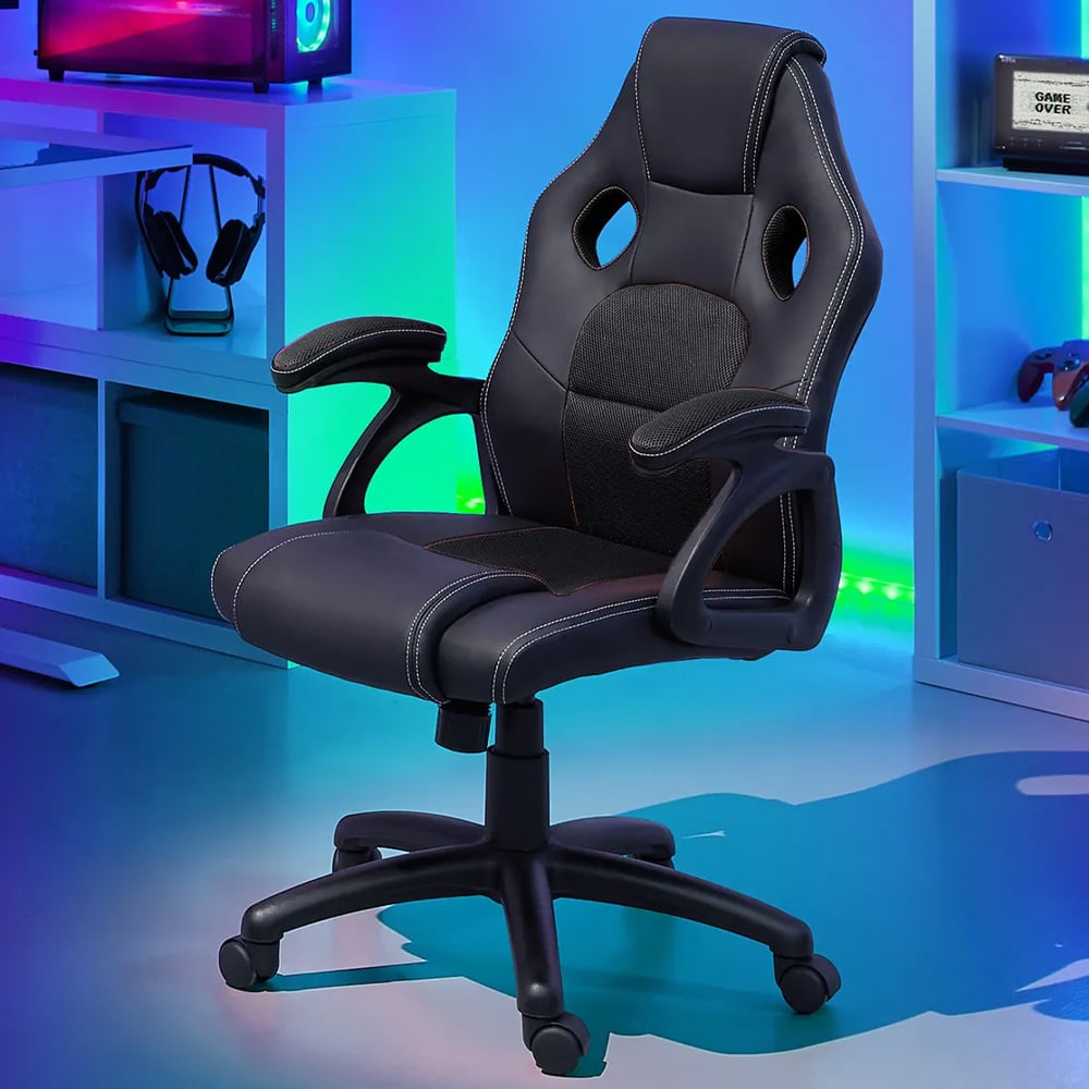 In this ergonomically shaped gaming chair from tectake, with its flowing lines, back support and comfortable padding, you'll be sure to finish in first place. Breathable mesh inserts wick moisture away whenever working or gaming brings you out in a sweat. The robust base of this swivel chair guarantees exceptional stability, while the abrasion-resistant double castors glide easily over the floor. The plastics used give the construction its impressive durability and make using this racing chair from tectake a unique experience. Perfect for the home and office environments, this gaming chair helps you complete work and gaming tasks efficiently.