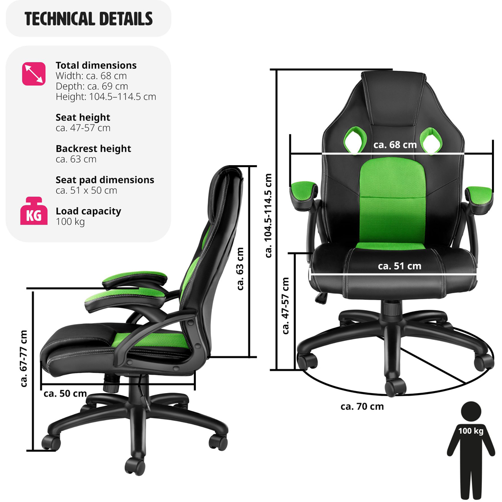 In this ergonomically shaped gaming chair from tectake, with its flowing lines, back support and comfortable padding, you'll be sure to finish in first place. Breathable mesh inserts wick moisture away whenever working or gaming brings you out in a sweat. The robust base of this swivel chair guarantees exceptional stability, while the abrasion-resistant double castors glide easily over the floor. The plastics used give the construction its impressive durability and make using this racing chair from tectake a unique experience. Perfect for the home and office environments, this gaming chair helps you complete work and gaming tasks efficiently.