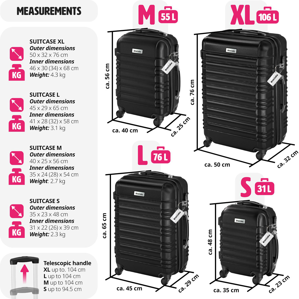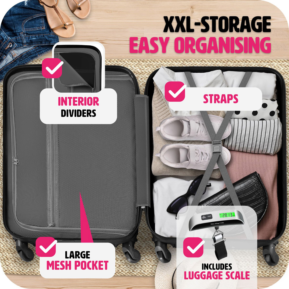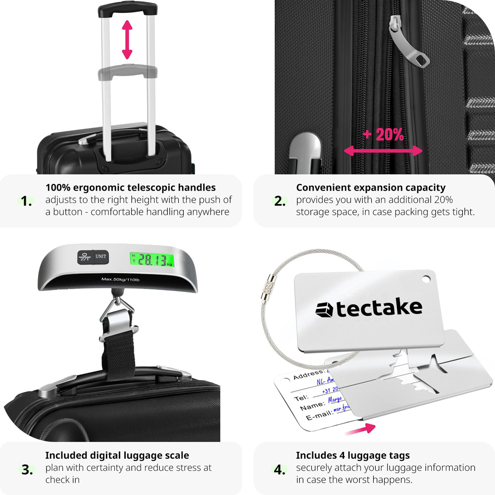With the four-piece Mila travel suitcase set from Tectake, you'll find the perfect companion for every journey. The 360° swivel wheels, the extending ergonomic handle, and the included luggage scale ensure a smooth and pleasant travel experience. Compression straps and a mesh pocket partition bring order to the impact-resistant and scratch-resistant hard shell suitcases, and the suitcases can expand by up to 20% in volume. Plus, thanks to the three-digit combination lock on each rolling suitcase, your travel belongings are reliably protected. The set includes small carry-on friendly cabin bags, as well large check-in size ones. This allows you to embark on every cruise, flight, and short trip with ease using the lightweight and stackable (once the wheels are removed) Mila trolley set.