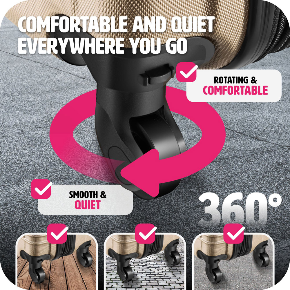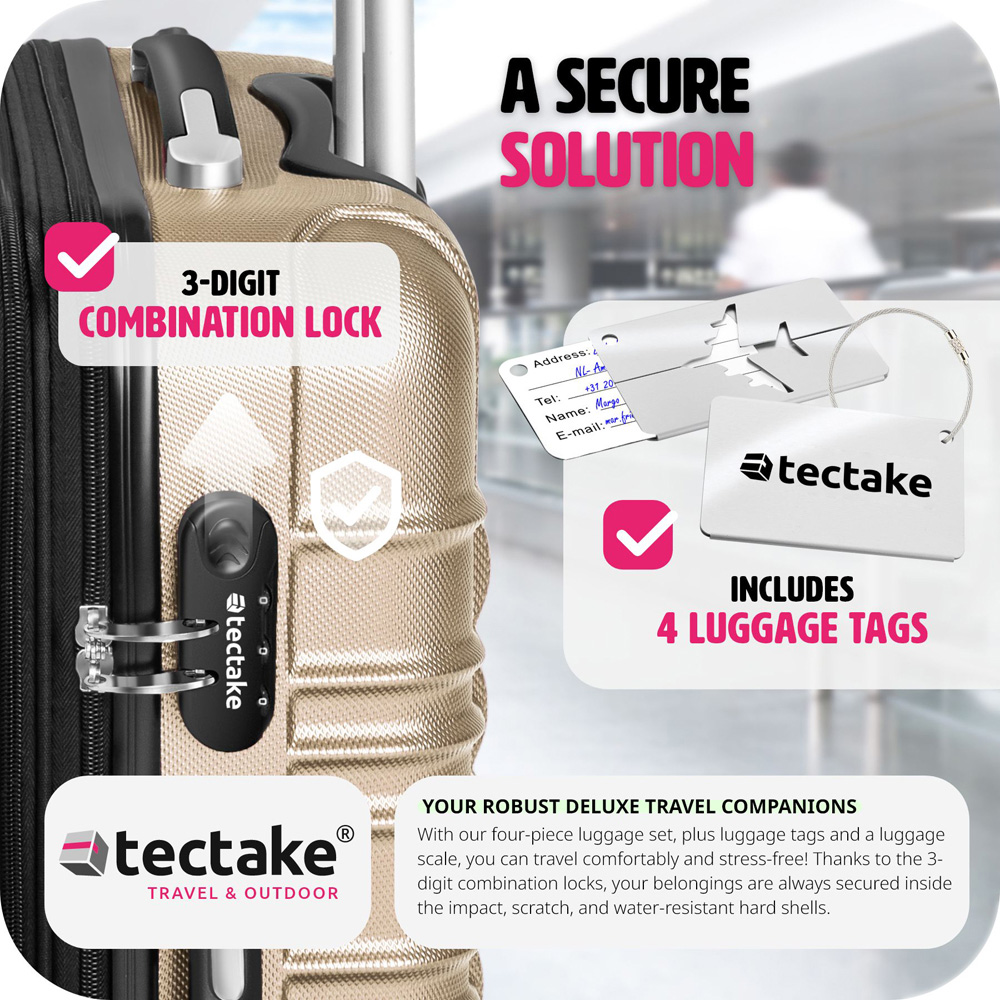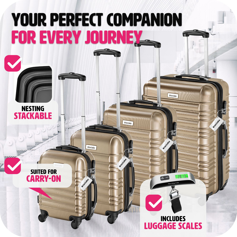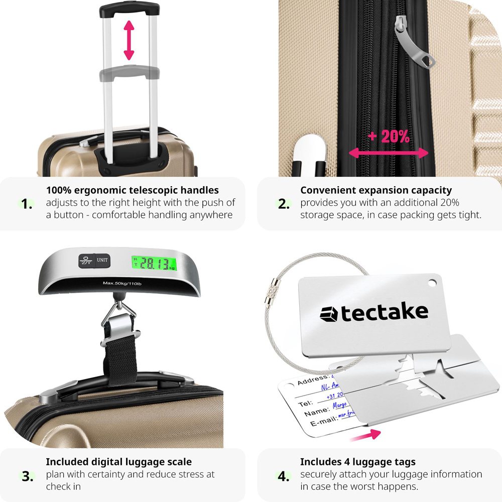 With the four-piece Mila travel suitcase set from Tectake, you'll find the perfect companion for every journey. The 360° swivel wheels, the extending ergonomic handle, and the included luggage scale ensure a smooth and pleasant travel experience. Compression straps and a mesh pocket partition bring order to the impact-resistant and scratch-resistant hard shell suitcases, and the suitcases can expand by up to 20% in volume. Plus, thanks to the three-digit combination lock on each rolling suitcase, your travel belongings are reliably protected. The set includes small carry-on friendly cabin bags, as well large check-in size ones. This allows you to embark on every cruise, flight, and short trip with ease using the lightweight and stackable (once the wheels are removed) Mila trolley set.