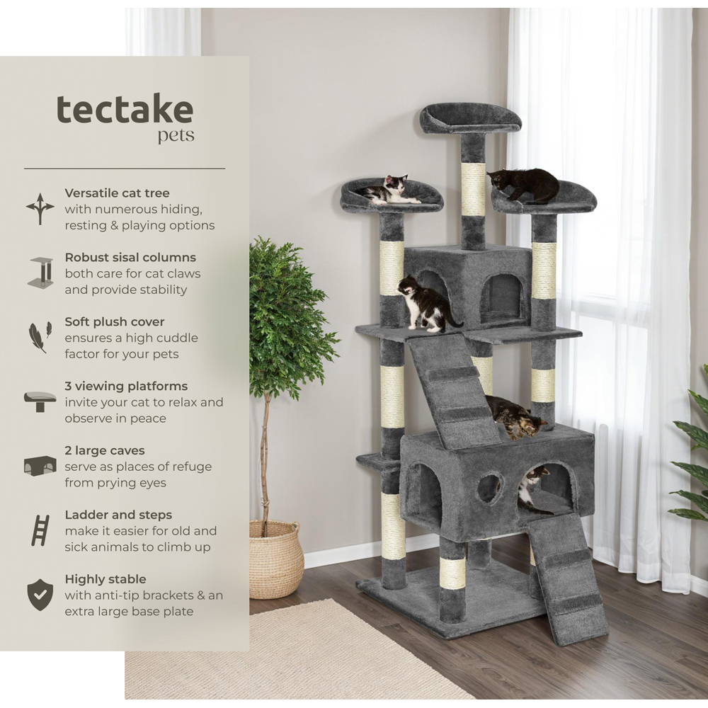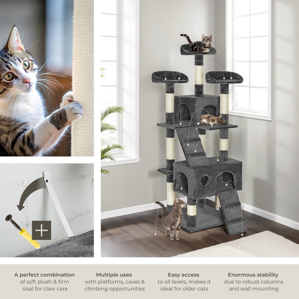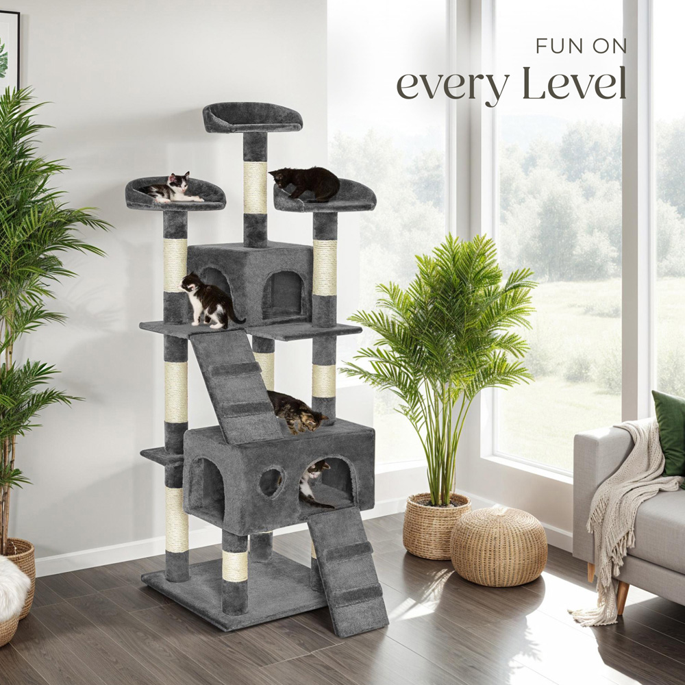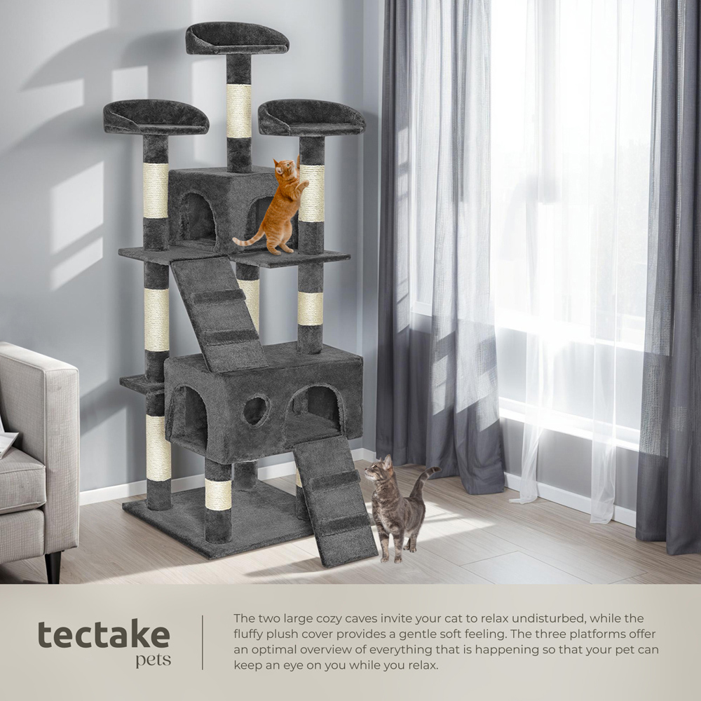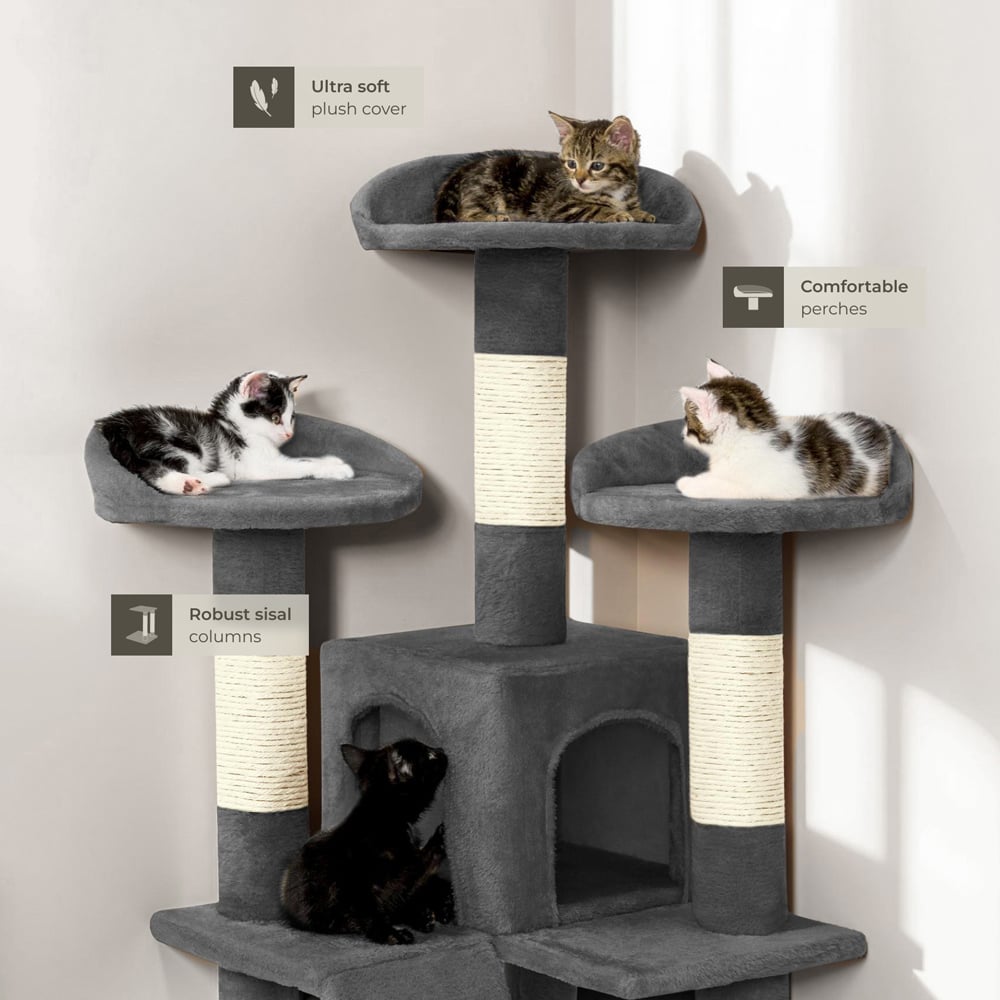 A cat tree is the perfect activity centre for your cat or kitten to play on and enjoy. The numerous scratching posts over different levels will allow your cat to remove old sheaths and sharpen their claws, without causing any damage to your furniture. But a cat tree is much more than just a scratching post. It incorporates numerous other different elements such as elevated platforms that cats can climb onto and jump between. Incorporated toy ramps can be used to play on whilst small houses give your pet somewhere to hide in and take naps. A cat tree will get plenty of use and is ideal in any cat owner's home.
