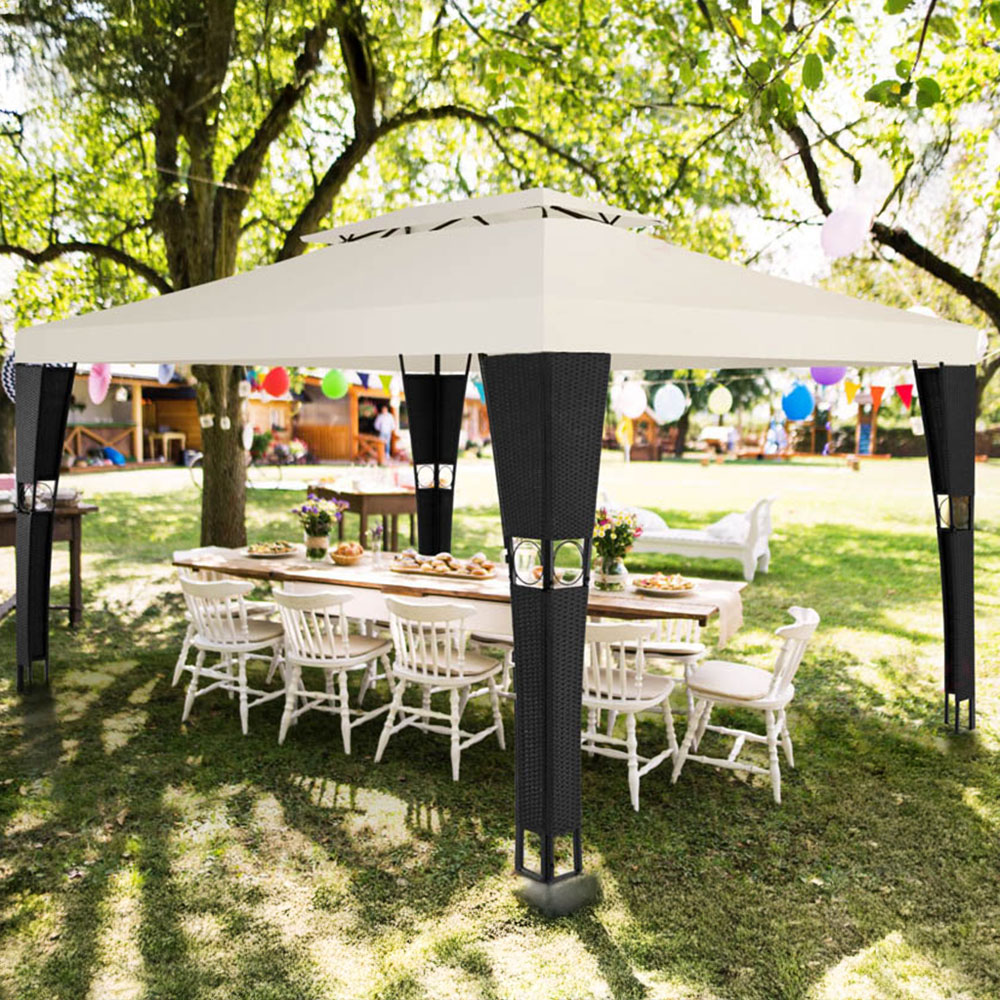 Turn your home outdoor garden into a wellness oasis with this rattan tectake Mona 4 x 3m Black and Cream Double Roof Gazebo. Enjoy hot days, warm summer evenings and lively garden parties under the shade of your gazebo's water-resistant roof. The raised roof panel lets stale air out, allowing fresh air to circulate. The powder-coated steel frame is covered with poly rattan and finished with ornamental details. Also great for dining under on a patio or outdoor area. Give your garden a touch of holiday feeling with this gorgeous rattan garden gazebo from Tectake.