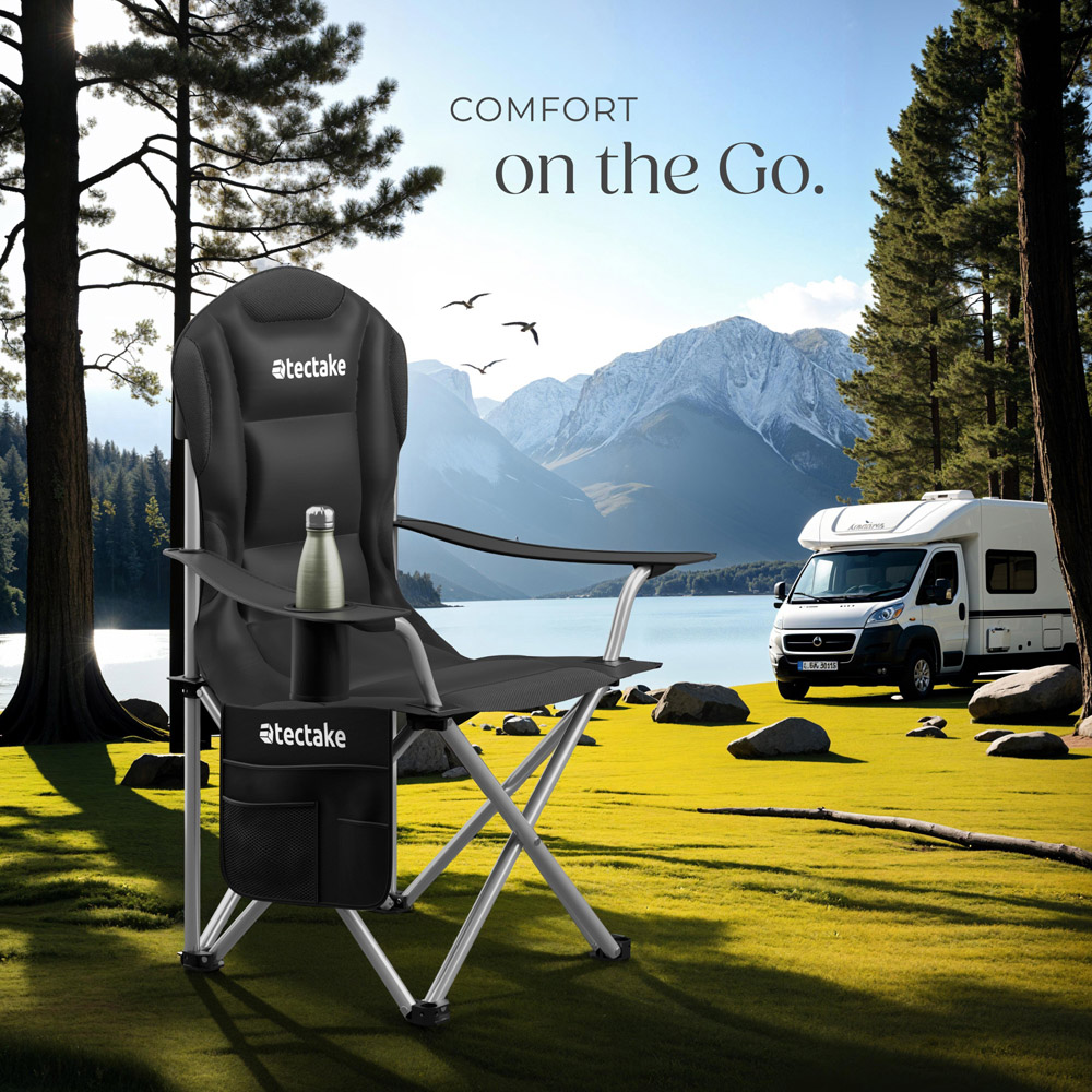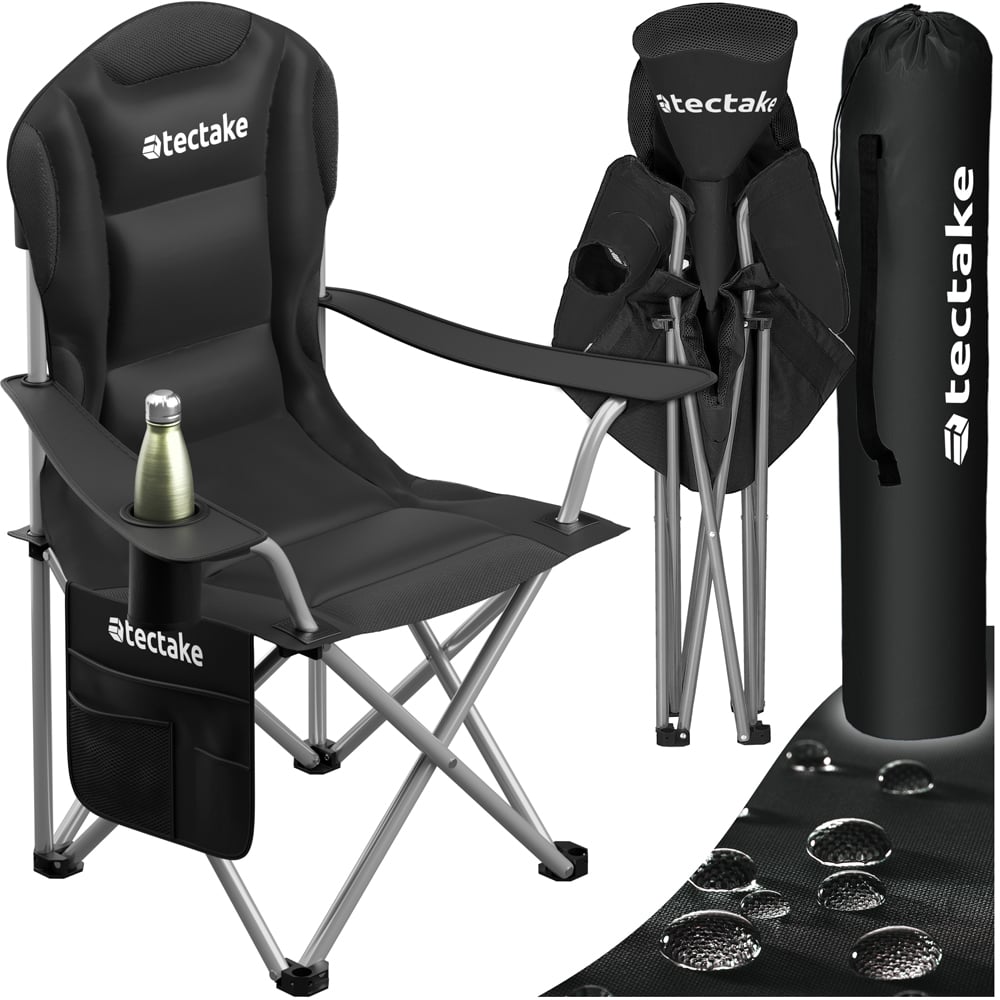 Discover the padded camping chair MTX from tectake, which makes your outdoor adventures even more comfortable. Delivered fully pre-assembled, it can be used immediately and offers you a comfortable seat for all occasions whether for festivals or relaxing days in the garden. Thanks to the clever folding function, the chair can be set up and taken down in no time ideal when you need to be quick. The soft padding ensures a first-class seating experience, even when sitting for longer periods, and the wide armrests are not only very comfortable but also functional: on the right armrest, there is an integrated cup holder and a practical storage bag with various compartments. Whether smartphone, book or snacks' you have everything important within reach. The solid and durable steel frame is coated with a high-quality powder coating, which provides additional robustness. In addition, the floor-protecting, non-slip feet, (two front ones can be fixed with pegs), ensure stability, even on uneven terrain. The 600D Oxford fabric is water and dirt-repellent, making the folding chair exceptionally easy to care for. With the supplied carrying bag, transport is child's play. You can comfortably sling the folding chair over your shoulder and effortlessly take it anywhere. Make every trip more comfortable with this pair of versatile folding camping chairs. Designed for outdoor adventures, these lightweight camping chairs are perfect for camping, hiking, festivals, or relaxing at the beach. The durable, foldable chairs offer easy portability and are quick to set up, making them ideal camping essentials. Use them as a fishing chair, a child's chair, or even a director's chair for ultimate convenience. These portable chairs feature a sturdy design, ensuring reliable support for all your outdoor needs. Perfect as beach chairs, deck chairs, or even folding garden chairs, they suit a variety of activities, from family picnics to casual camp gatherings. Compact and collapsible, they double as fold-away chairs for easy storage, ensuring they're always ready for your next adventure. Whether you're upgrading your camping gear or looking for affordable and cheap camping furniture, these fold-up chairs are the ultimate choice for comfort, durability, and style. A must-have for every outdoor enthusiast! The camping chair MTX from tectake combines comfort, functionality and durability the perfect choice for all your outdoor activities.