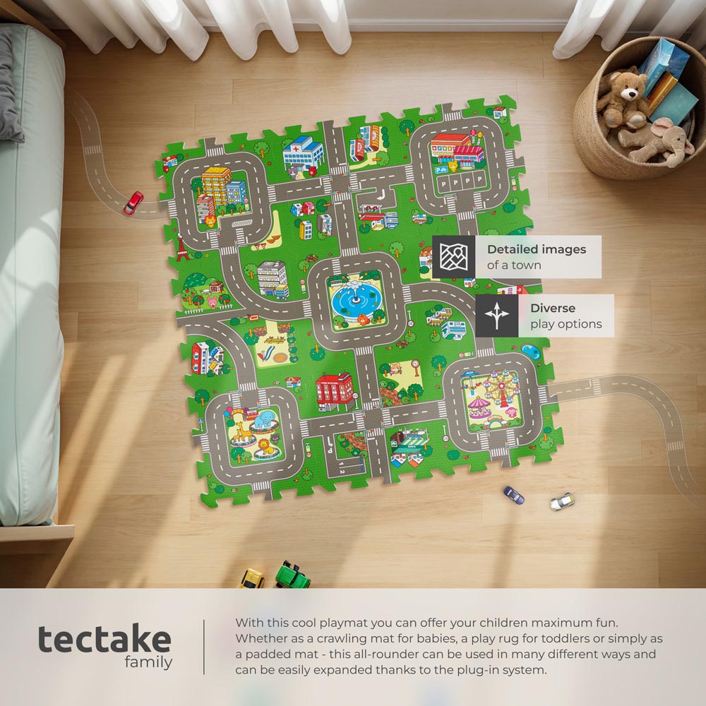 Introduce your child to endless fun with the MyCity puzzle mat from tectake, designed to spark creativity and play. Featuring a vibrant city motif, this playmat offers flexible designs that can be easily rearranged to create new worlds of adventure. Some pieces fit into a set pattern, while others can be mixed and matched for even more playtime possibilities. Made from high-quality EVA foam, this baby playmat is soft, safe, and free from harmful substances. The non-slip underside ensures a secure grip, even during energetic play, while the mat absorbs footstep noise and provides gentle cushioning with every step. Ideal for any home, this mat can be used as a crawling mat for babies, a comfortable play rug for toddlers, or a padded base for various activities. Space-saving and easy to stack, the puzzle mat is designed for convenience and easy storage. It's also incredibly easy to clean, simply wipe it with a damp cloth for a hygienic and spotless surface. This versatile playmat makes the perfect gift and addition to your child's toys and playtime essentials. The MyCity puzzle mat fosters imagination and motor skill development, transforming any room into a lively, colourful playground. The best choice for your child's development and fun!