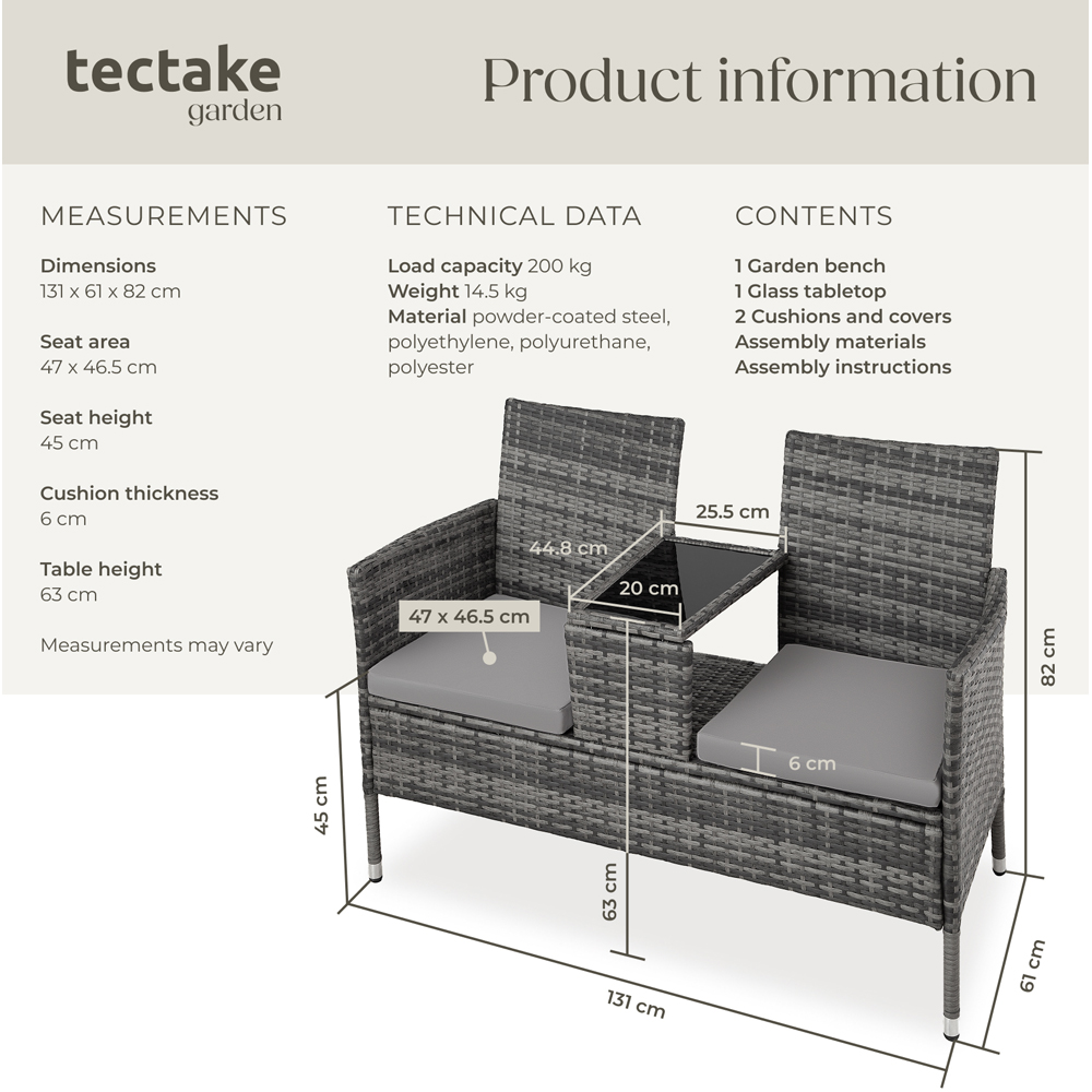 This easy to care for, tectake Narbonne 2 Seater Grey and Light Grey Garden Bench with its comfortable seat cushion promises relaxing hours together with a loved one in your garden, on the patio, balcony or in the conservatory. Polyrattan is especially suitable for outdoor use and fits wonderfully into the garden scenery. The benches seat covers are removable and washable. Another highlight of this beautiful garden furniture is the integrated central table, which is situated between the two chairs, and is the perfect place for your drinks, books or sun cream. The table features a stylish glass plate top, meaning your garden bench can be used for a romantic outdoor dining experience with your partner. All in all, this two seater chair set is practical, stylish and durable, making it an ideal piece of outdoor furniture.