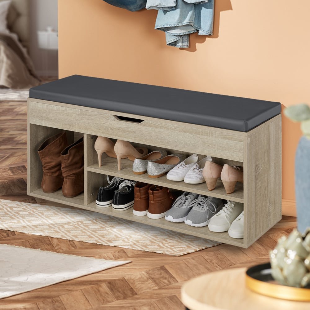 Organise your home with the stylish and functional Natalya Shoe Rack from tectake. This stylish shoe cabinet from tectake is the ideal storage place for your favourite shoes at home or in the office. The bench not only provides a comfortable place to sit whilst putting shoes on, but also keeps them organised. The padded seat of the storage cupboard is ideal for slipping in and out of your favourite shoes. The subtle colouring of the robust piece of furniture fits perfectly into almost any environment, be it the hallway, bedroom or porch. You can also store scarves, gloves, hats and other accessories in the upper folding drawer compartment of the rack. Ensure your entrance room area is perfectly equipped with the versatile tectake shoe cabinet product. This sleek storage cabinet features four storage spaces and a comfortable bench seat cushion, perfect for sitting while you put on your shoes. Designed to hold up to nine pairs of shoes, it's an ideal solution for your hallway or room, providing both storage and extra seating. Available in black, white or oak effect, this shoe rack seamlessly fits into any decor, enhancing your furniture while keeping your shoes neatly stored and easily accessible. The compact yet spacious design makes it a practical addition to any entryway or closet. Bring order and style to your hallway with this versatile and durable shoe cabinet today!