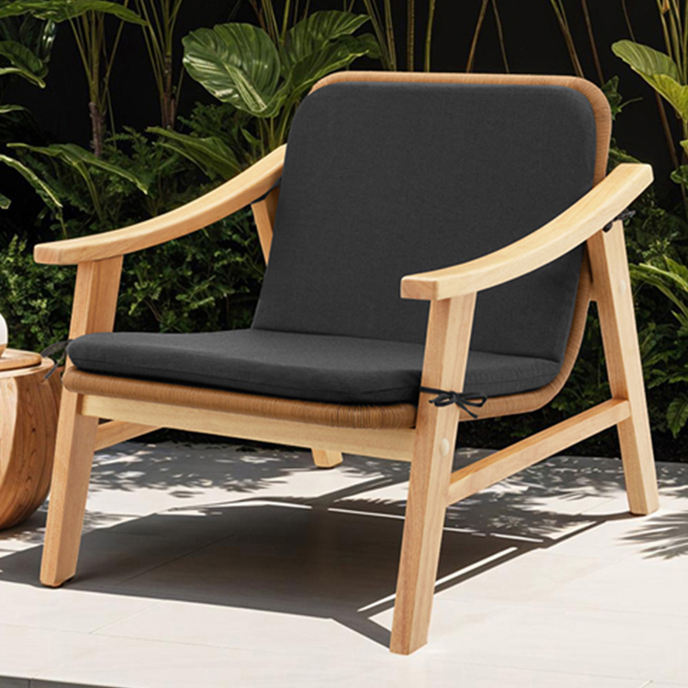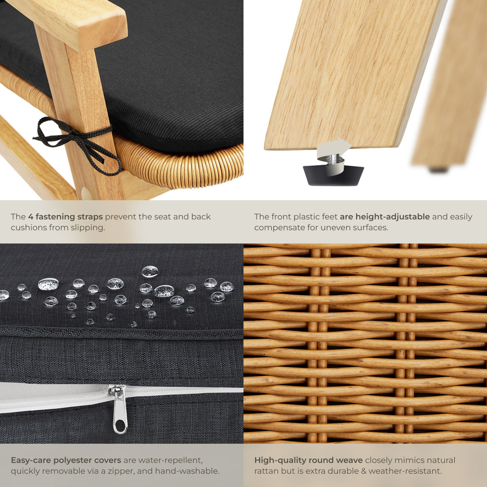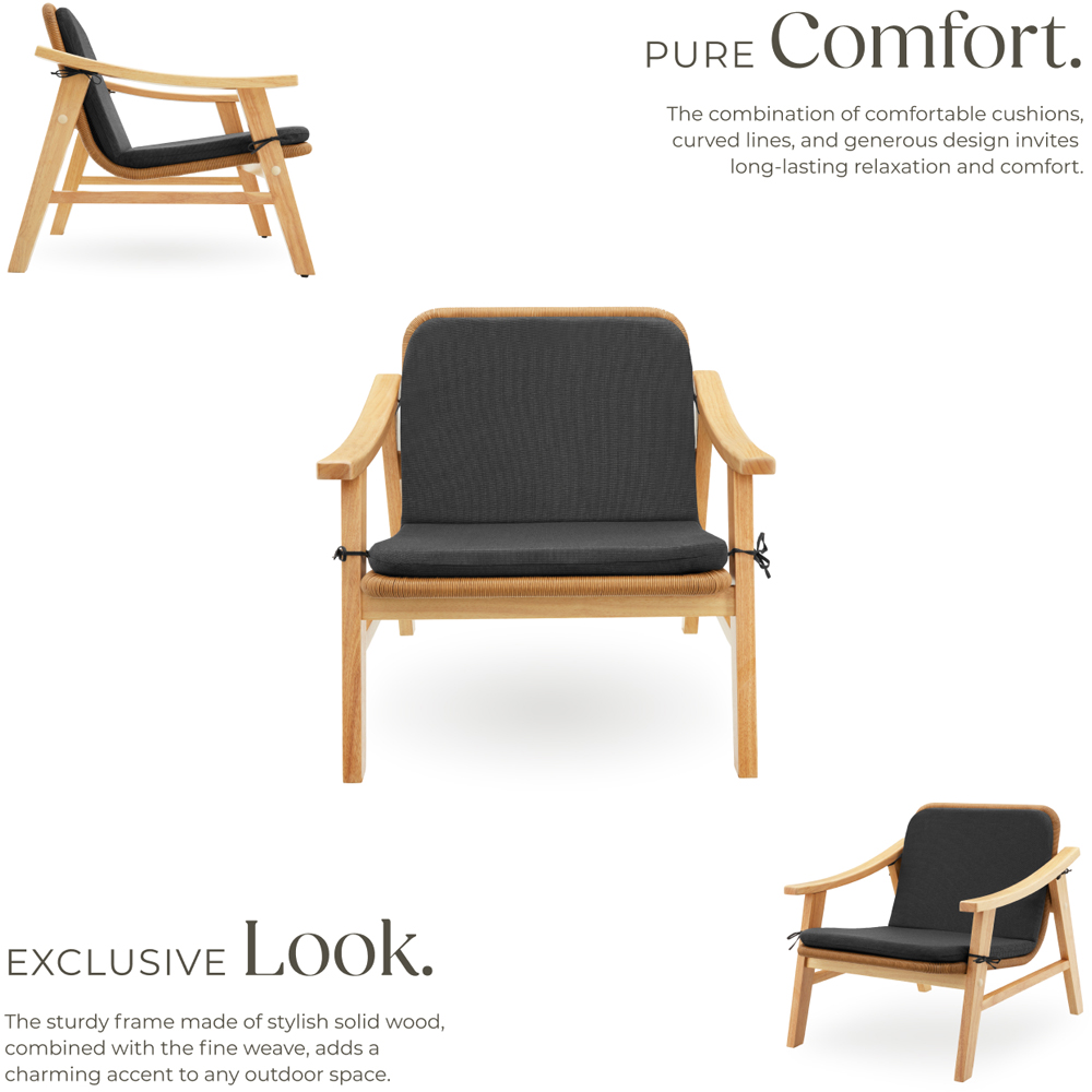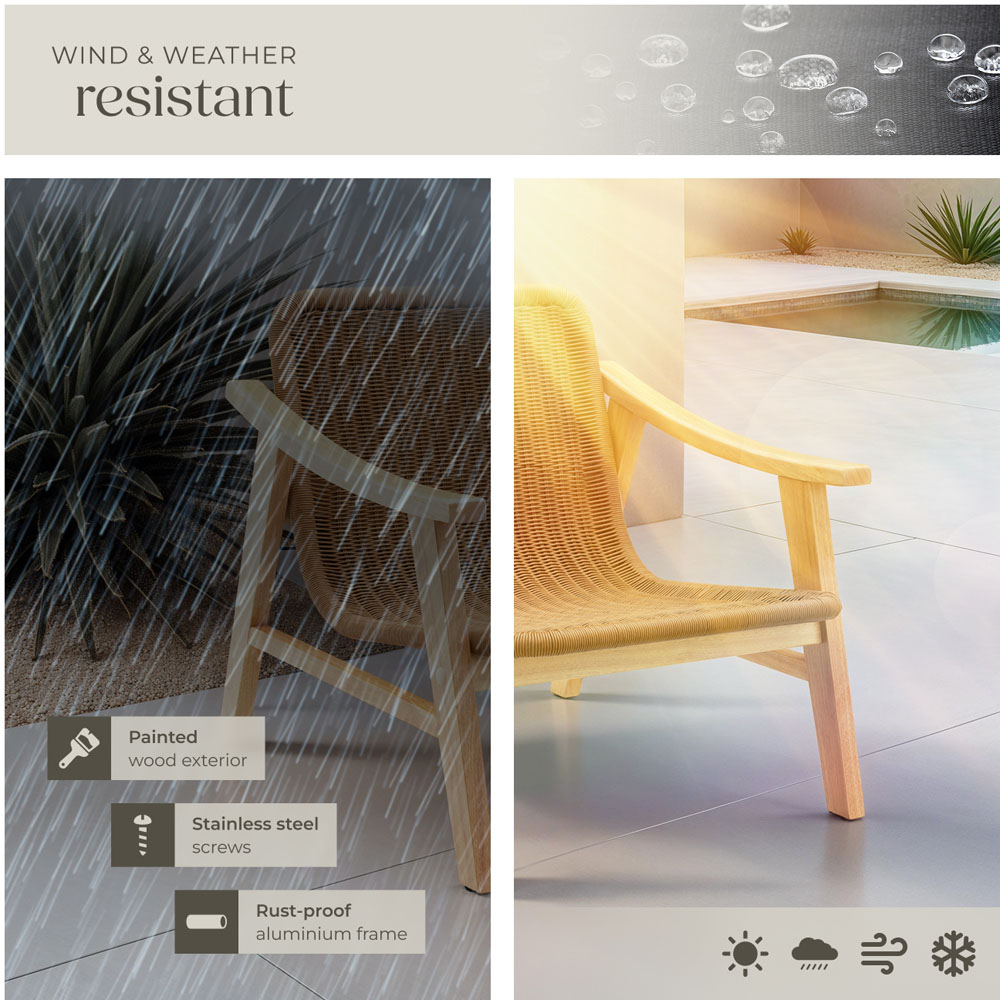 Discover the garden chair Treviso from tectake - the ideal addition to your patio, balcony, or conservatory. The wooden chair combines elegant design with comfortable ease and blends seamlessly into any outdoor setting. The rattan armchair impresses with its ultra-robust and absolutely weatherproof construction. The chair's solid wood frame with protective coating meets a frame made of rust-proof aluminium, which is encased in an extremely durable polyrattan weave in a natural-looking round shape. These high-quality materials also give the outdoor furniture a chic look and, together with the two flexible screw feet, ensure stability, safety, and durability. Wide armrests and the seat and back cushion, perfectly held in place by four string accessories, create maximum comfort and invite relaxation, perfect for lounging or as part of an outdoor dining table set. The product features a water-resistant polyester cushion cover equipped with two zippers, making it removable and washable, making it particularly easy to care for. Enjoy relaxing hours in your home on the garden chair Treviso from tectake and be inspired by its inviting appearance!