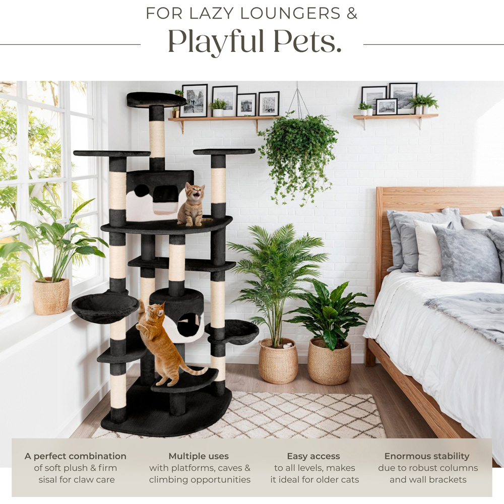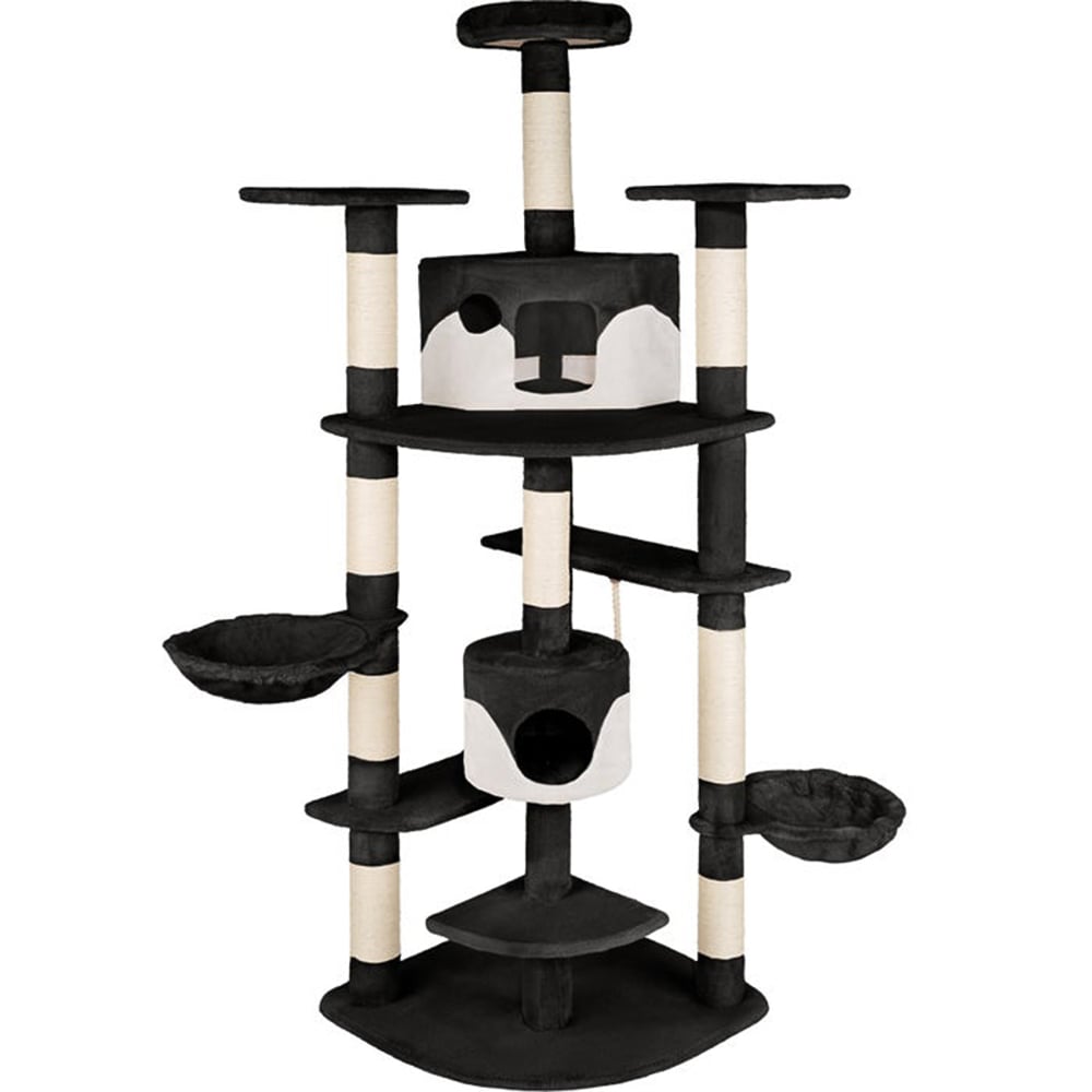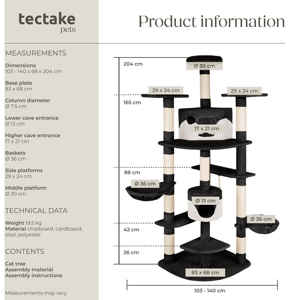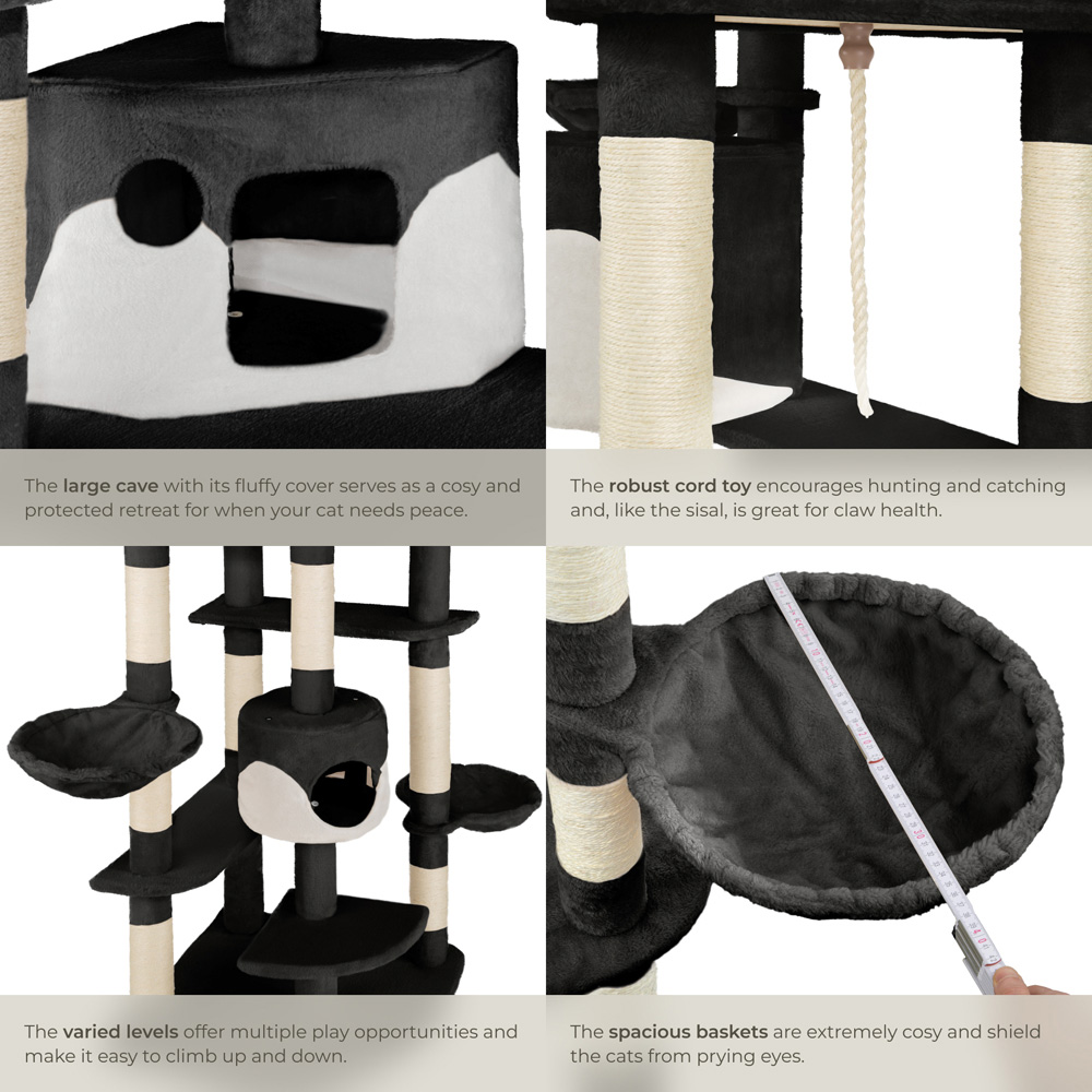 This cat tree Nelly is a vertical activity centre for your cat, reaching up to a height of over 2 metres. Your cat or kitten will love to use the numerous large cat scratching posts, spread over several levels, to sharpen their claws and remove excess sheaths, thus leaving your furniture untarnished. Also included in this cat tree is a cat house and cave, ideal for your pet to take a nap in a cosy, private hollow. Hanging rope toys are also included which your kitten will love to play with as they learn to hunt and pounce. Platforms at increasing heights are perfect for relaxing and lounging, until the upmost platform, which your cat will love to sit on and use to survey their kingdom from their new home. The cosy overhanging hammocks complete the product as a perfect cat nap spot. Get this highly enriching cat tree from tectake and satisfy your cats natural instincts to climb, jump and scratch. Give your pet the ultimate playground with a large cat tree designed for endless fun and relaxation. Featuring multiple scratching posts, cosy beds, and engaging toys, this cat tree is perfect for keeping your cat active and entertained. With elevated platforms offering a perfect view, your furry friend will love their new favourite spot. Ideal for pets of all sizes, these trees provide the perfect combination of comfort and play.
