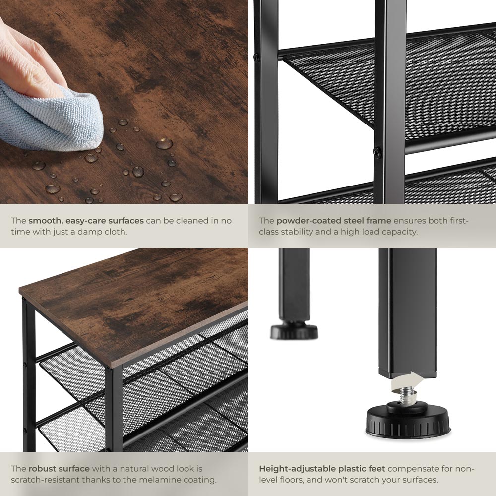 Elevate hallway organisation with a rustic dark wood shoe organiser that combines a grained surface shelf and three grid shelves for an inviting industrial look, perfectly blending warm wood and cool steel for any entryway or living space. Enjoy the flexibility of a stable frame with adjustable screw feet, while the three resilient grid shelves offer ample space for shoes and quick access to your favourite pairs. With its light construction and simple elegance, this wooden shoe rack with 3 shelves for hallway storage brings practical charm to your home or office.